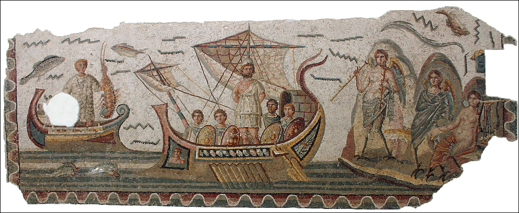 Odysseus and the Sirens. Mosaic from Dougga in the Bardo Museum, Tunis.