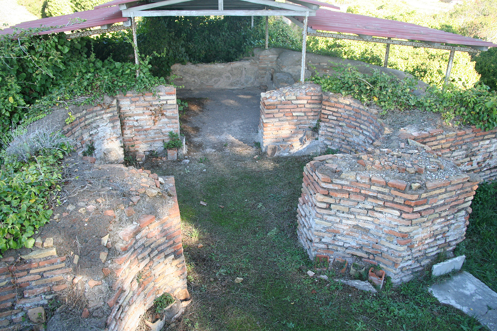 This tiny bath (c. 24 x 16 metres, area c. 385 square metres) was built in late antiquity in the south-west corner of the Warehouse of the Grain Measurers (I,XIX,4). It is 0.45-0.80 m. above the present street level. It was accessible only from the "warehouse" (grain measuring centre) to the east. A small staircase leads to frigidarium E in the south part, with three semicircular basins. To the north are the heated rooms. At the north end is caldarium A, also with three basins. There is another small staircase in the back wall of the eastern basin. Behind the caldarium is a furnace (H). Remains of plaster can be seen on most of the walls. In the basins are remains of marble revetment. Hadrianic bricks were reused here. Heres has dated the baths to c. 450-500 AD (opus latericium), with additions from c. 490-550 AD (opus vittatum). That makes this one of the latest buildings in Ostia. |