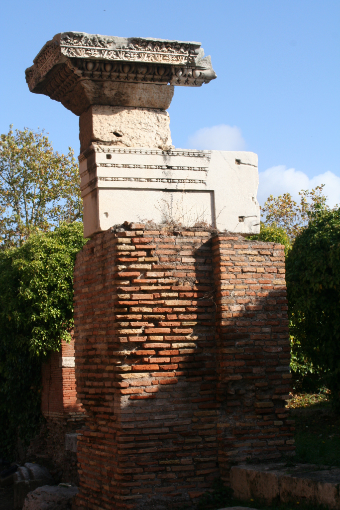 | The remains of the honorary arch of Caracalla can be seen to the south of the theatre (II,VII,2), to the north of the Porticus of the Triumphal Arches (V,XI,7), which was named after the arch. The four corner piers of the arch flank the central entrance of the theatre (opus vittatum and opus latericium). Therefore the arch was also some sort of covered vestibule of the theatre. The piers are fairly small (the size ranges from 0.92 x 1.35 to 1.09 x 1.60 m.). The north-south distance between the piers (that is, the width of the Decumanus) is c. 5.85 m. The west-east distance (along the theatre) is c. 13.65. Fragments have been found of the marble decoration: columns, architraves, friezes, and cornices. In the area to the south of the theatre fragments were found of a huge marble inscription (c. 6.30 x 1.80 m.), coming from the attic of the arch. It will have been fastened in the upper east side, so that it was seen by those who came from Rome and entered the city through the Porta Romana. The letters may have been coloured. The following text has been proposed: