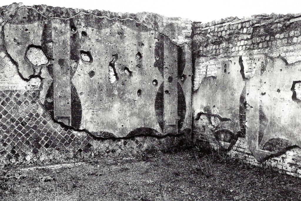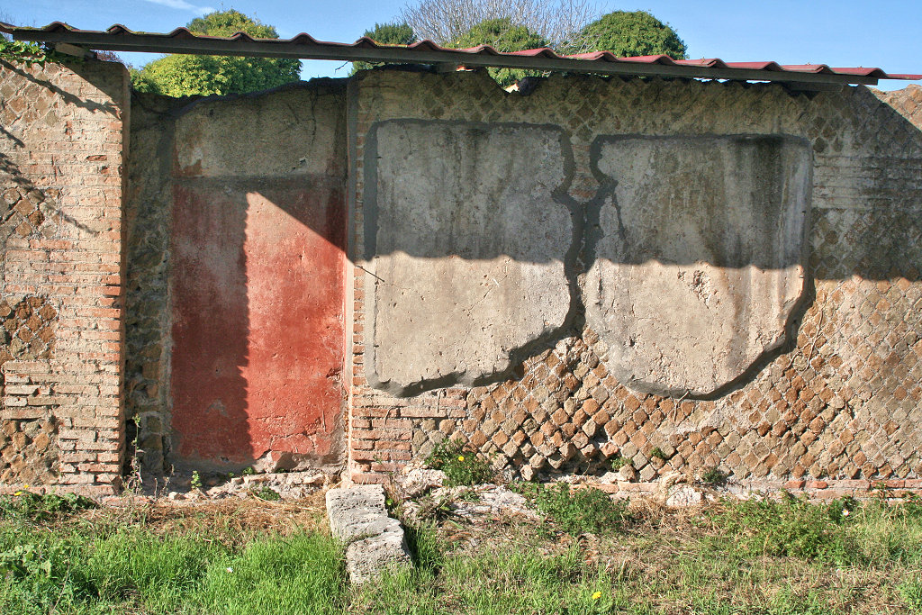 This building was erected in the Hadrianic period. It has a facade of opus mixtum, which is quite unusual - normally when opus mixtum is used it is found inside the building, whereas the facade is made of bricks only. On the ground floor are two apartments, flanking an external staircase. Thin and possibly later dividing walls create rooms. The function of the rooms is suggested by remains of mosaics, and of red and yellow paintings with miniatures: large white areas are flanked on all four sides by red segments of circles; in between are wide vertical yellow bands. The paintings have been placed in the Antonine period.  |