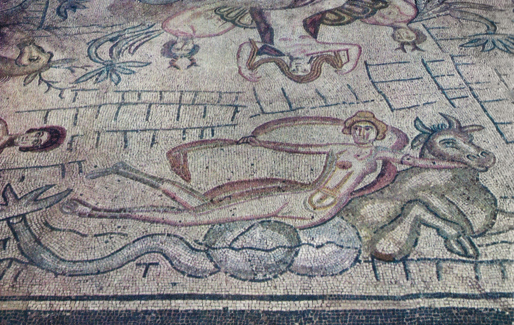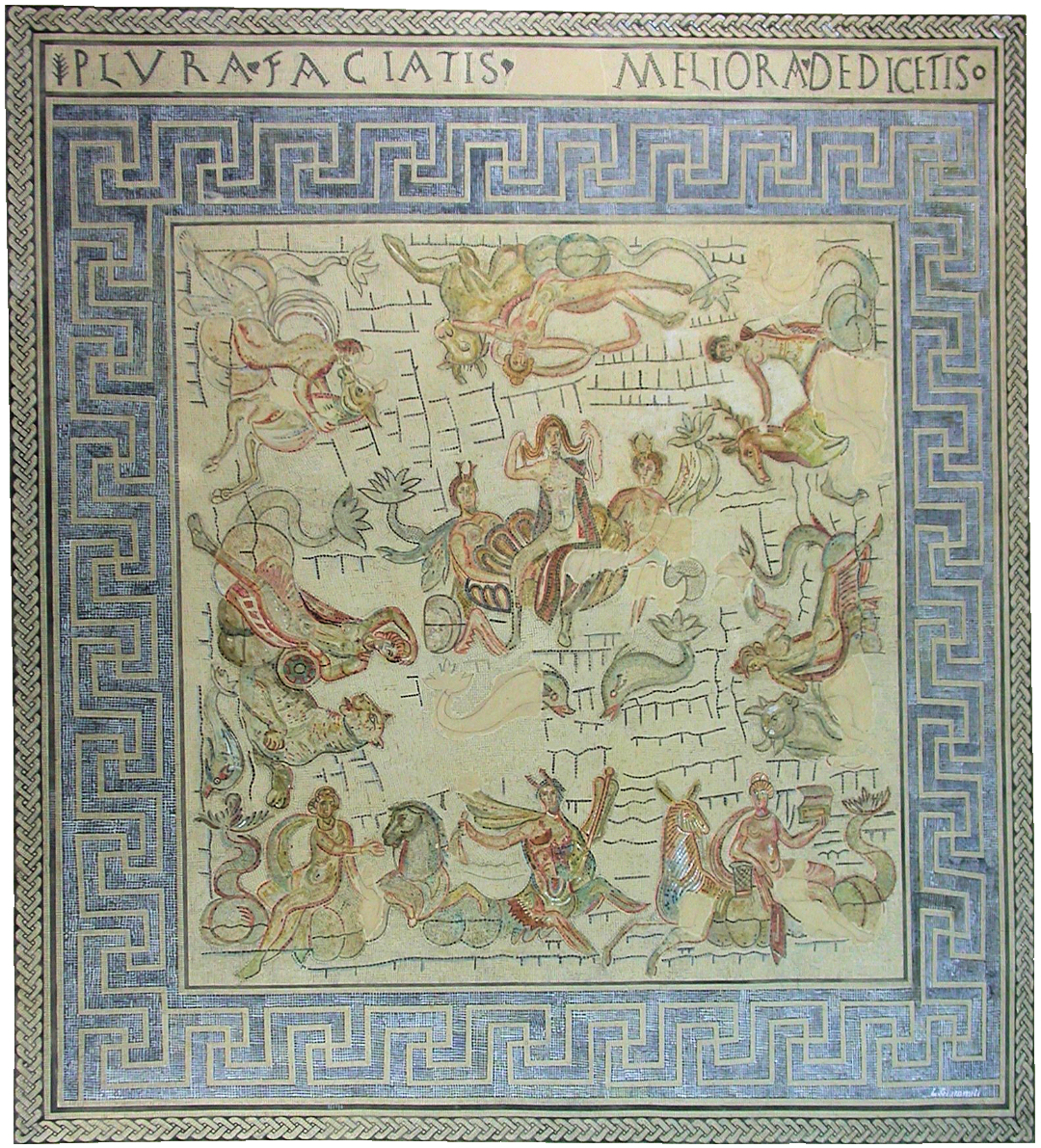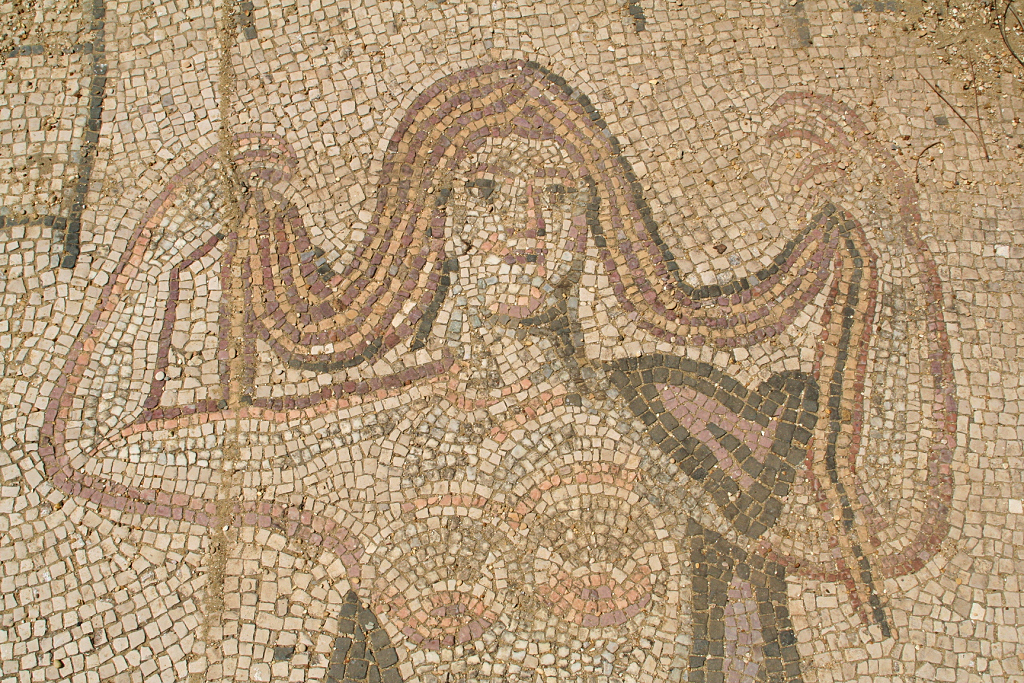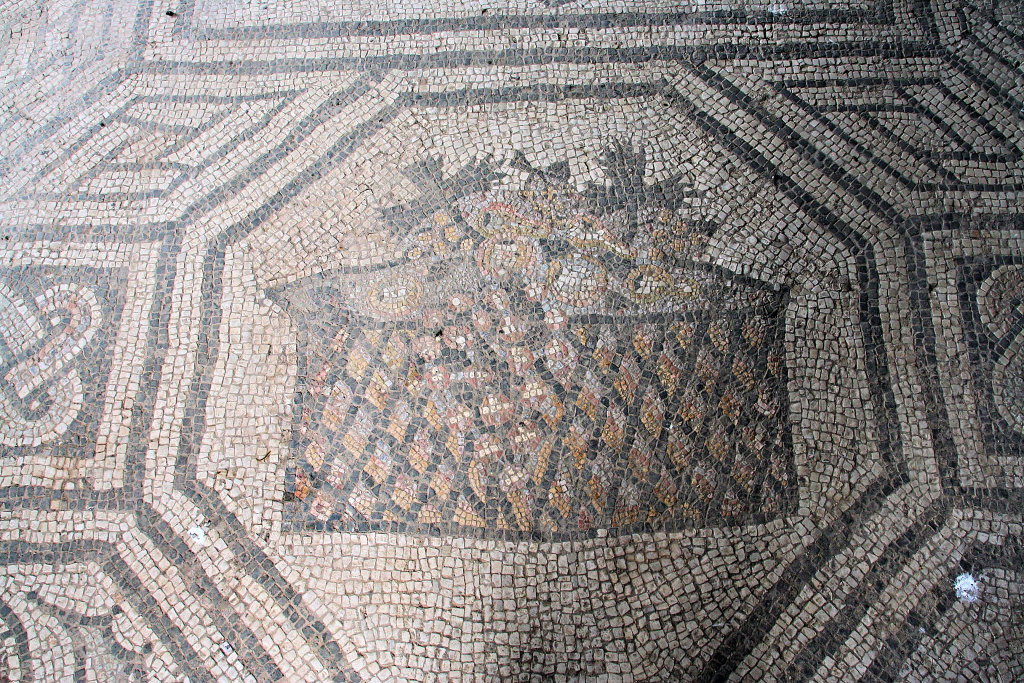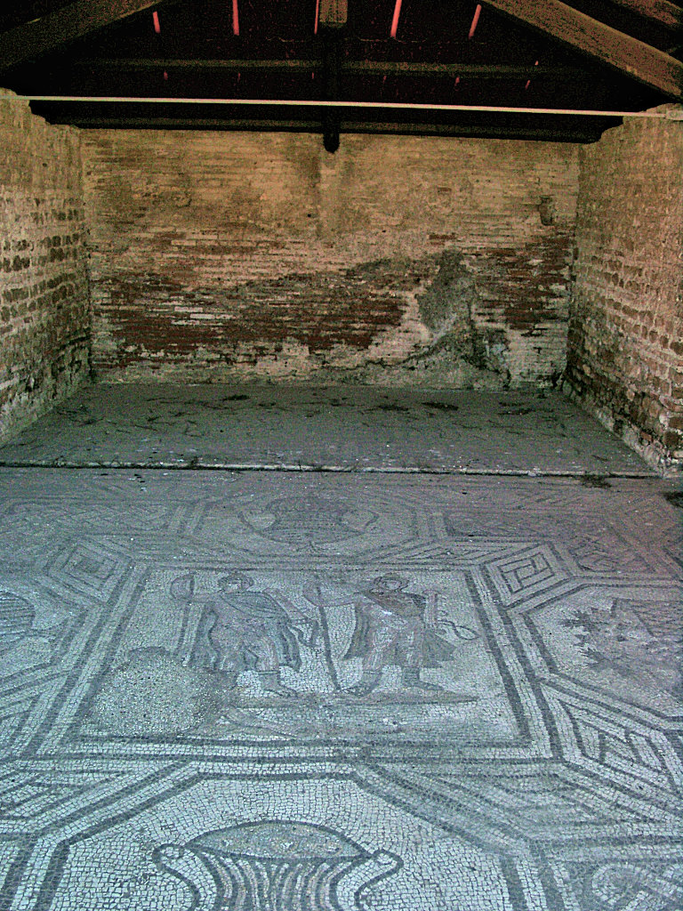 | The House of the Dioscures was built in apartments and shops in the south corner of the Garden Houses. In the first quarter of the fifth century walls in latericium and vittatum were added to the opus mixtum from the second century AD. Other walls were demolished. Click here to open a detailed plan of the house with the building phases (Heres 1982, fig. 84). Click here to open a detailed plan of the house with the mosaics (Parco Archeologico di Ostia Antica). Click here to open a reconstructed plan of the Hadrianic apartments and shops in which the building was installed (Parco Archeologico di Ostia Antica). Vestibule A, with a curved wall and a curved threshold, is the main entrance. In the back wall of room C are two rectangular niches flanking a semicircular niche. The niches are precisely opposite the main entrance of the building, but this would be noticed only after walking through the vestibule and room B. Room D, next to the main entrance, may have been a shop. It was connected with the house through room E. The south part of the house is shielded by a wall, behind which is service corridor U. Rooms T and S, next to a staircase, may have been used for storage. Corridor F and the former medianum G received light from the courtyard of the Garden Houses, but three windows in room G were blocked. In hall H an alcove was built, on the floor of which is a black-and-white mosaic with meanders. In front of that, in the hall itself, is a polychrome mosaic with in the centre the two Dioscures, Castor and Pollux. They are surrounded by octagons with a beaker, fruit, kantharoi, vases and baskets. This was a reception room. Room I was the main hall (10.00 x 10.50), also with a polychrome mosaic. We see Venus Anadiomene in a shell supported by two tritons, surrounded by Nereids on sea monsters. At the north side is the inscription PLVRA FACIATIS MELIORA DEDICETIS, "That you may do more and set up better things!". Parallels for the inscription have been found in North Africa. The smaller rooms M and L both have an alcove. In the walls of the alcove in M are terracotta pipes for the heating of the room. The hot air came from a nearby private bath. Room M has a polychrome mosaic with octagons and stylized plants. In room L is a black-and-white geometric mosaic, but also with a palm branch and the letters PE, which most likely stand for Saint Peter. Along the west side are bathing rooms that were reached from the north. In frigidarium O are two apsidal basins. Next to O is a small room with two windows. Room P was a caldarium, witness the raised floor and pipes in the wall. Room Q is a second caldarium, with a rectangular and an apsidal basin. All these bathing rooms were decorated with marble. The small corridor R has a hacked out niche in the back wall. To the north-west of the bathing rooms is a cistern. The Dioscures were worshipped in Ostia as protectors of shipping, also as a public cult. Therefore this house may have been inhabited by an official working for the supply, especially grain supply, of Rome. He lived at a time when Rome itself was threatened by invasions. In 410 AD Alaric sacked Rome. It is noteworthy that at such a late date pagan deities are depicted. |  Plan of the house. After SO I. |