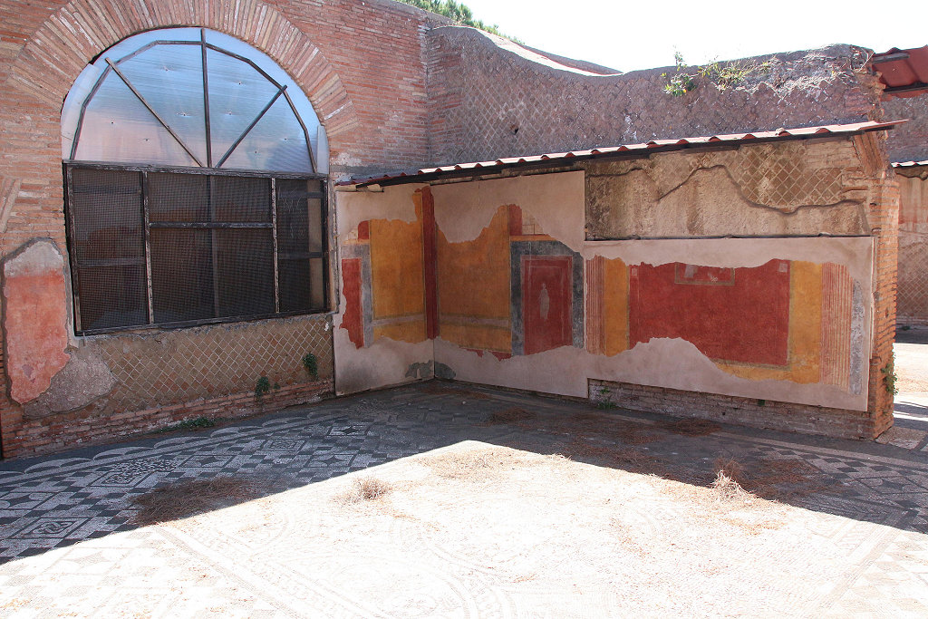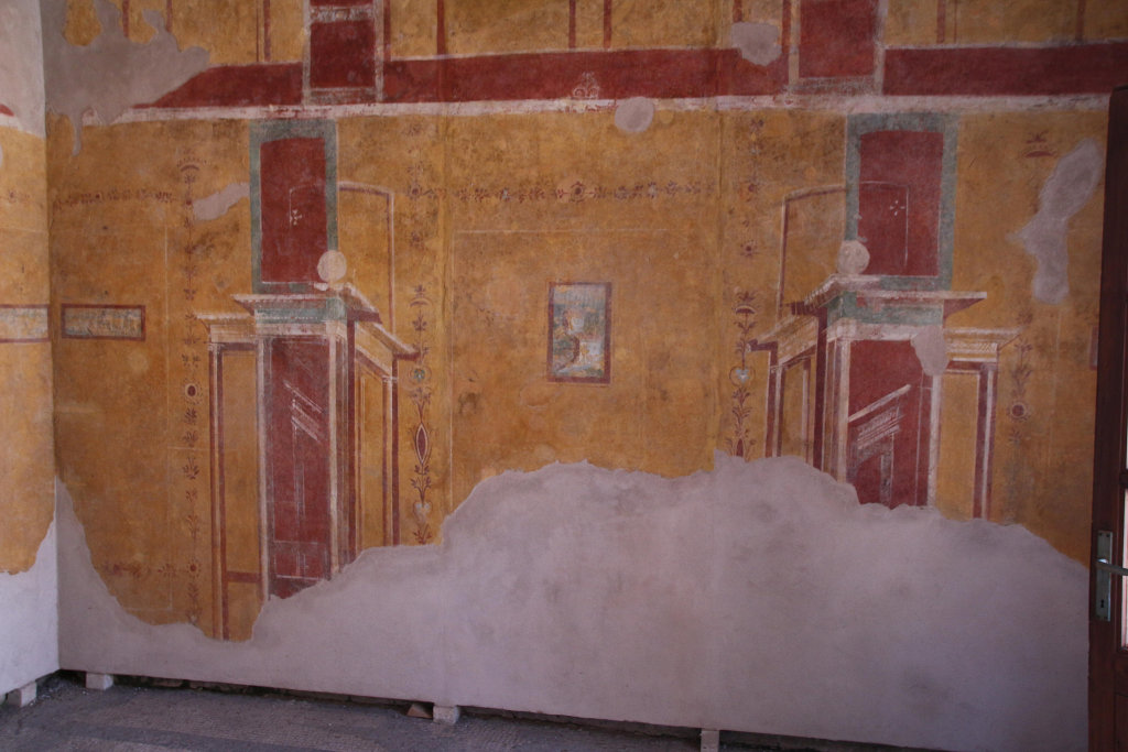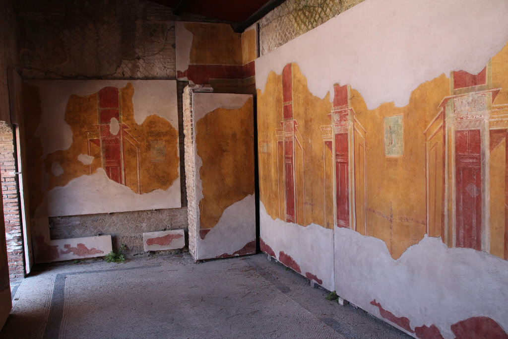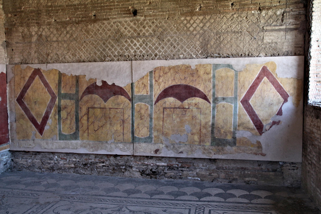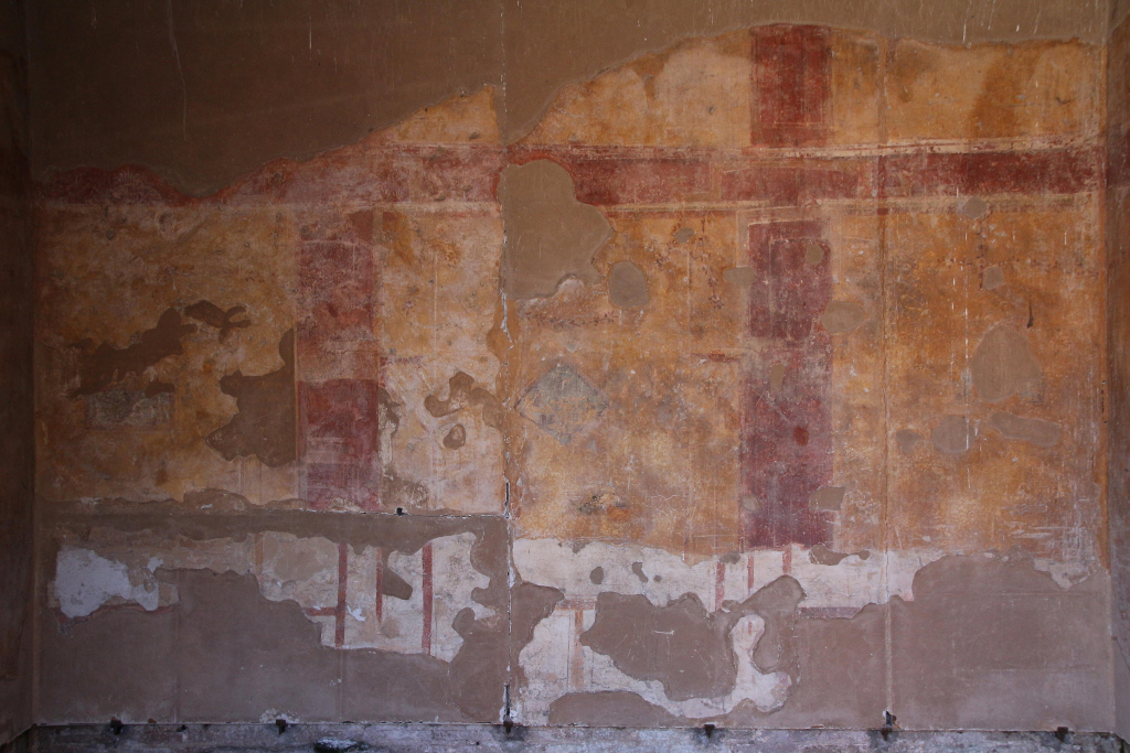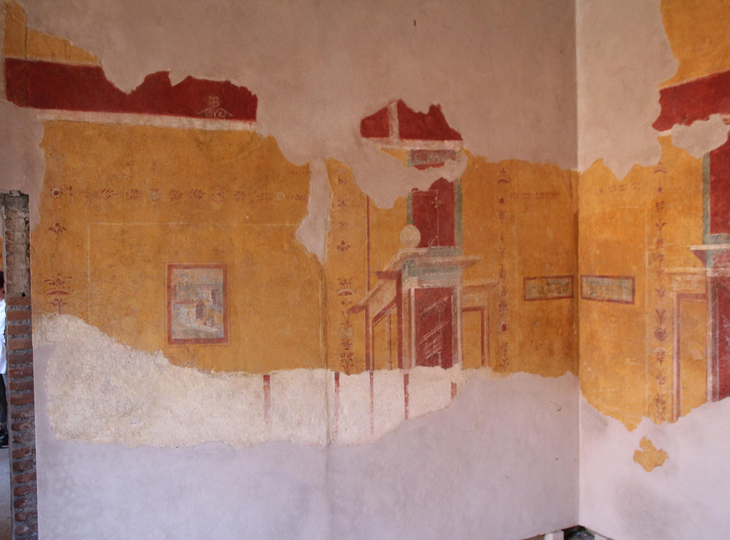 The House of the Yellow Walls is a Hadrianic medianum-apartment, forming part of the Garden Houses. Excavations of the lower levels have shown that a building was begun a bit earlier, in the Trajanic period, but never completed (due to a fire?). The house faces the inner garden of the complex and is back-to-back with the House of the Graffito (III,IX,21). The building is entered from the south through a door in front of a tripartite entrance of the inner garden of the complex. Next to vestibule 1, covered by a barrel vault, is an inner staircase, 2. Medianum 3 is flanked by two representative rooms, 7 and 8. The west wall of these three rooms is pierced by many windows. Room 7 is flanked by an annex, connected through a door and a wide window. To the east of the medianum are two small rooms, 4 and 5. Some reinforcing piers were added later in rooms 3, 6 and 7, possibly after an earthquake. All rooms have black-and-white mosaics, from the Hadrianic period. Those in rooms 1, 3, 4, 5 and 6 are very simple. Those in rooms 7 and 8 are quite elaborate, with geometric and vegetative motifs, chalices, birds, and heads. The one in room 7 has a central panel that is slightly off-center, suggesting that two couches were standing here, in other words that this was a dining room. The annex 6 may have been a kitchen and service area. Rooms 4 and 5 may have been bedrooms. The paintings In room 3, the medianum, remains of three layers have been preserved. Hardly anything can be seen of the first. The second layer has a high, red socle (2.10 m.), with yellow paint above. On the red socle traces have been discerned of candelabra and aediculae, painted in white, yellow and green, and of little landscapes with a blue background. These paintings were later partly covered with a very thin white layer with red bands. In rooms 4, 5 and 6 a bit can be seen of the first layer. The second layer, which gave the building its name, is preserved quite well. There was a red socle (h. 0.58) with green vegetation. Above, wide red bands surround two rows of large yellow panels. White-and-green aediculae were painted both on the bands and the panels. In the centre of the yellow panels are small landscapes, rectangular and lozenge-shaped, surrounded by garlands. In room 6 a head of Oceanus has emerged behind a secondary brick pier. The third layer is preserved well in room 4. On a white background are simple, red aediculae, a basket with flowers, and a gazelle. The aediculae have some intentionally oblique bands. In room 7 are large red and yellow panels, surrounded by wide, white and green bands, and flanked by white, fluted columns. In the centre of one of the red panels is a "floating" female figure. The paintings in room 8 are similar to those in room 7. There are some "floating" figures: a Maenad and Silenus. In a small panel (0.50 x 0.52 m.) two naked male figures are depicted: Hercules, holding a club, and Achelous, the chief of all river deities, holding a trident. On one of the walls are paintings of a much later date, imitating marble revetment. The decoration with red and yellow panels has been assigned to the Antonine period. The next phase (room 4, wall d) is an example of the so-called Linear Style, dated to the Severan period. The last phase (room 8, wall c) belongs to the second half of the third or fourth century.  |