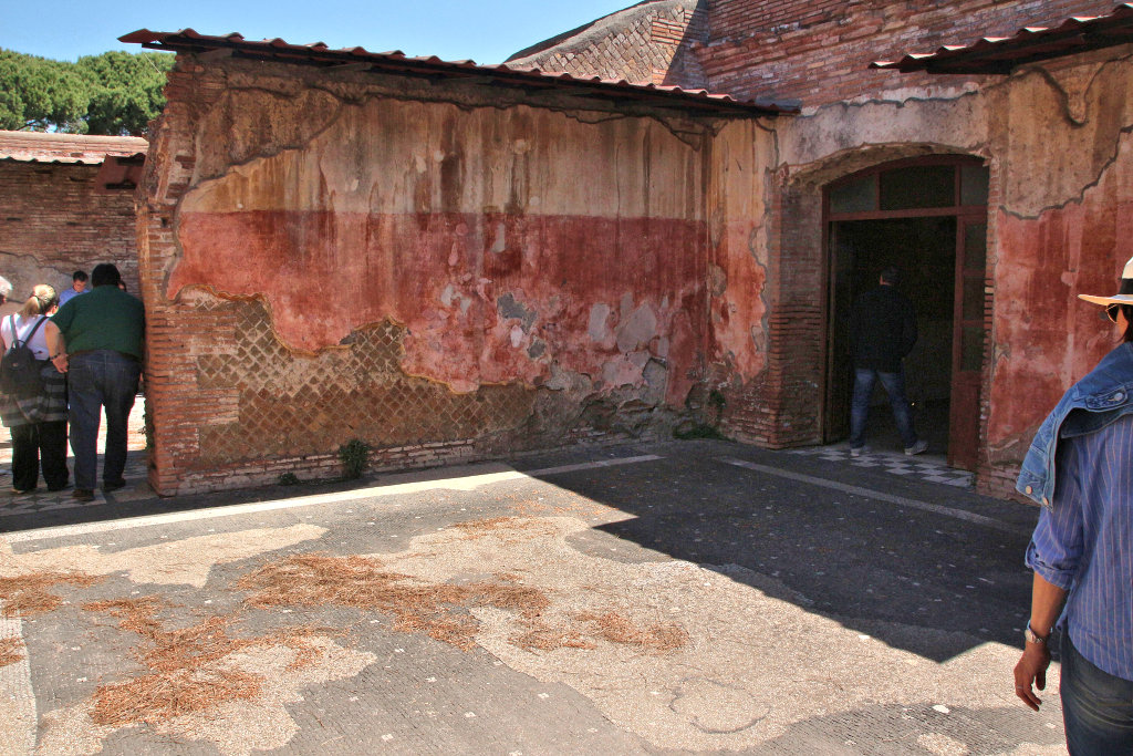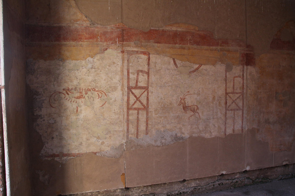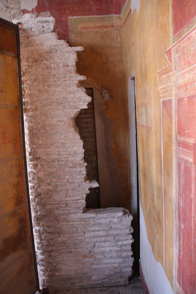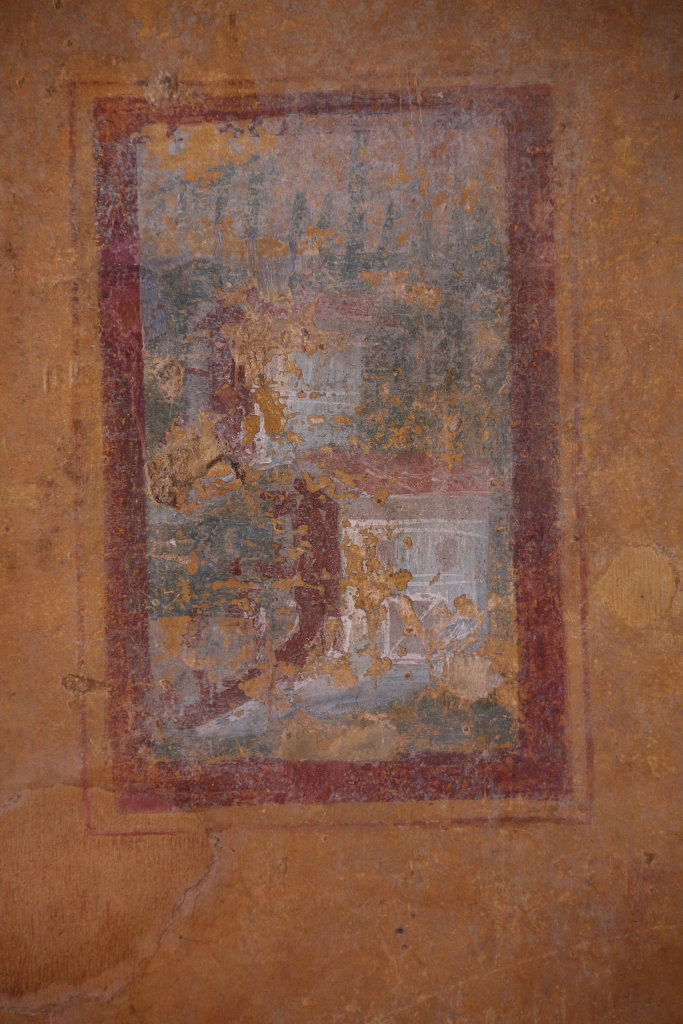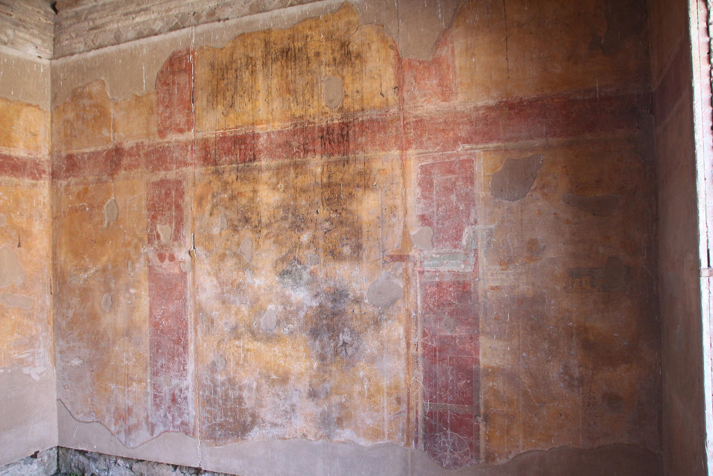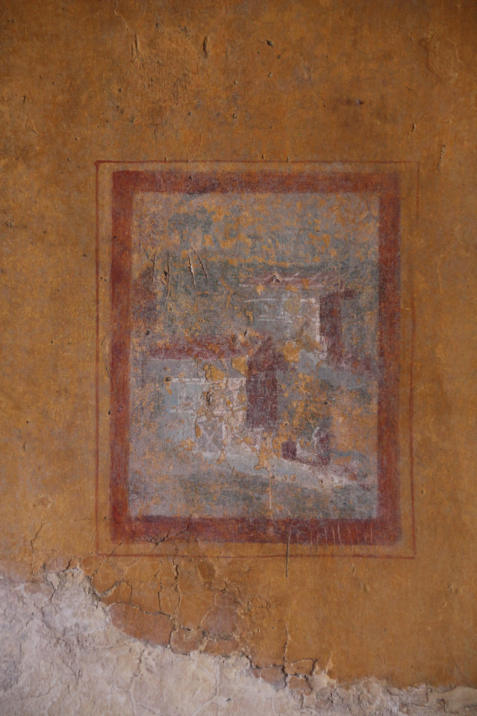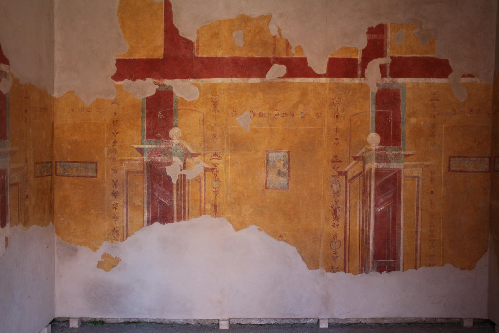The House of the Yellow Walls is a Hadrianic medianum-apartment, forming part of the Garden Houses. Excavations of the lower levels have shown that a building was begun a bit earlier, in the Trajanic period, but never completed (due to a fire?). The house faces the inner garden of the complex and is back-to-back with the House of the Graffito (III,IX,21). The building is entered from the south through a door in front of a tripartite entrance of the inner garden of the complex. Next to vestibule 1, covered by a barrel vault, is an inner staircase, 2. Medianum 3 is flanked by two representative rooms, 7 and 8. The west wall of these three rooms is pierced by many windows. Room 7 is flanked by an annex, connected through a door and a wide window. To the east of the medianum are two small rooms, 4 and 5. Some reinforcing piers were added later in rooms 3, 6 and 7, possibly after an earthquake. All rooms have black-and-white mosaics, from the Hadrianic period. Those in rooms 1, 3, 4, 5 and 6 are very simple. Those in rooms 7 and 8 are quite elaborate, with geometric and vegetative motifs, chalices, birds, and heads. The one in room 7 has a central panel that is slightly off-center, suggesting that two couches were standing here, in other words that this was a dining room. The annex 6 may have been a kitchen and service area. Rooms 4 and 5 may have been bedrooms. The paintings In room 3, the medianum, remains of three layers have been preserved. Hardly anything can be seen of the first. The second layer has a high, red socle (2.10 m.), with yellow paint above. On the red socle traces have been discerned of candelabra and aediculae, painted in white, yellow and green, and of little landscapes with a blue background. These paintings were later partly covered with a very thin white layer with red bands. In rooms 4, 5 and 6 a bit can be seen of the first layer. The second layer, which gave the building its name, is preserved quite well. There was a red socle (h. 0.58) with green vegetation. Above, wide red bands surround two rows of large yellow panels. White-and-green aediculae were painted both on the bands and the panels. In the centre of the yellow panels are small landscapes, rectangular and lozenge-shaped, surrounded by garlands. In room 6 a head of Oceanus has emerged behind a secondary brick pier. The third layer is preserved well in room 4. On a white background are simple, red aediculae, a basket with flowers, and a gazelle. The aediculae have some intentionally oblique bands. In room 7 are large red and yellow panels, surrounded by wide, white and green bands, and flanked by white, fluted columns. In the centre of one of the red panels is a "floating" female figure. The paintings in room 8 are similar to those in room 7. There are some "floating" figures: a Maenad and Silenus. In a small panel (0.50 x 0.52 m.) two naked male figures are depicted: Hercules, holding a club, and Achelous, the chief of all river deities, holding a trident. On one of the walls are paintings of a much later date, imitating marble revetment. The decoration with red and yellow panels has been assigned to the Antonine period. The next phase (room 4, wall d) is an example of the so-called Linear Style, dated to the Severan period. The last phase (room 8, wall c) belongs to the second half of the third or fourth century.  |