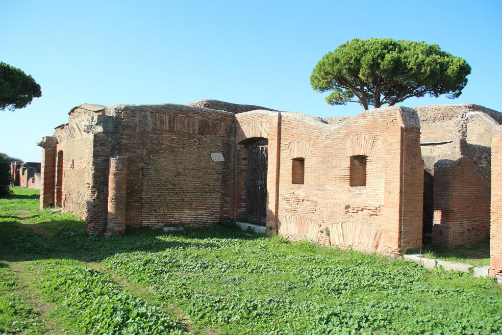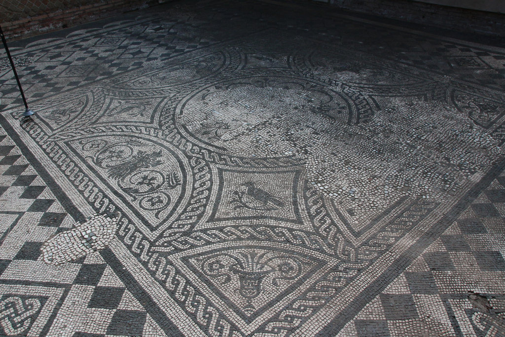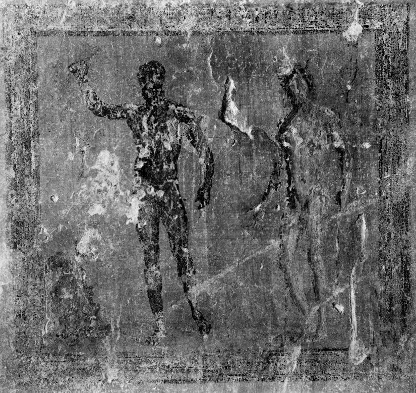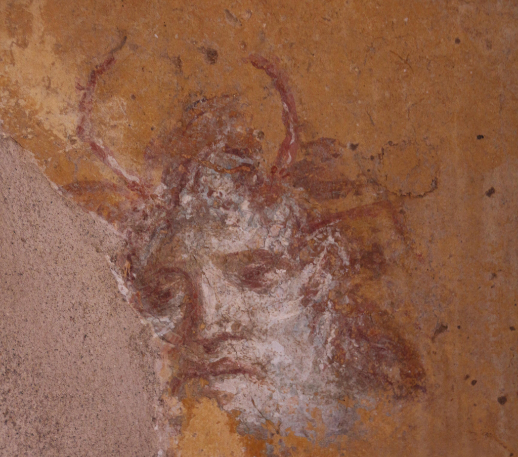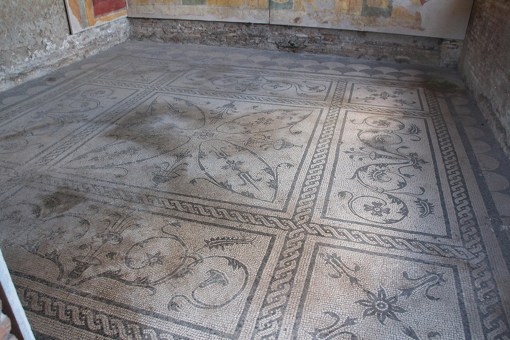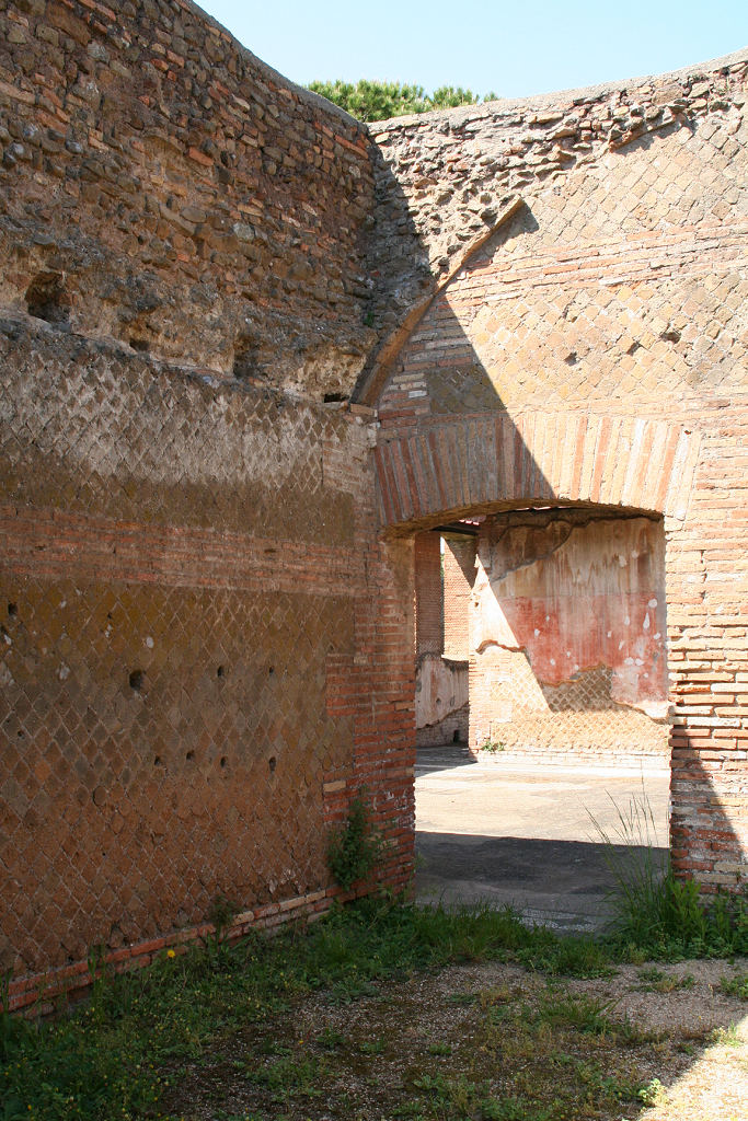 The House of the Yellow Walls is a Hadrianic medianum-apartment, forming part of the Garden Houses. Excavations of the lower levels have shown that a building was begun a bit earlier, in the Trajanic period, but never completed (due to a fire?). The house faces the inner garden of the complex and is back-to-back with the House of the Graffito (III,IX,21). The building is entered from the south through a door in front of a tripartite entrance of the inner garden of the complex. Next to vestibule 1, covered by a barrel vault, is an inner staircase, 2. Medianum 3 is flanked by two representative rooms, 7 and 8. The west wall of these three rooms is pierced by many windows. Room 7 is flanked by an annex, connected through a door and a wide window. To the east of the medianum are two small rooms, 4 and 5. Some reinforcing piers were added later in rooms 3, 6 and 7, possibly after an earthquake. All rooms have black-and-white mosaics, from the Hadrianic period. Those in rooms 1, 3, 4, 5 and 6 are very simple. Those in rooms 7 and 8 are quite elaborate, with geometric and vegetative motifs, chalices, birds, and heads. The one in room 7 has a central panel that is slightly off-center, suggesting that two couches were standing here, in other words that this was a dining room. The annex 6 may have been a kitchen and service area. Rooms 4 and 5 may have been bedrooms. The paintings In room 3, the medianum, remains of three layers have been preserved. Hardly anything can be seen of the first. The second layer has a high, red socle (2.10 m.), with yellow paint above. On the red socle traces have been discerned of candelabra and aediculae, painted in white, yellow and green, and of little landscapes with a blue background. These paintings were later partly covered with a very thin white layer with red bands. In rooms 4, 5 and 6 a bit can be seen of the first layer. The second layer, which gave the building its name, is preserved quite well. There was a red socle (h. 0.58) with green vegetation. Above, wide red bands surround two rows of large yellow panels. White-and-green aediculae were painted both on the bands and the panels. In the centre of the yellow panels are small landscapes, rectangular and lozenge-shaped, surrounded by garlands. In room 6 a head of Oceanus has emerged behind a secondary brick pier. The third layer is preserved well in room 4. On a white background are simple, red aediculae, a basket with flowers, and a gazelle. The aediculae have some intentionally oblique bands. In room 7 are large red and yellow panels, surrounded by wide, white and green bands, and flanked by white, fluted columns. In the centre of one of the red panels is a "floating" female figure. The paintings in room 8 are similar to those in room 7. There are some "floating" figures: a Maenad and Silenus. In a small panel (0.50 x 0.52 m.) two naked male figures are depicted: Hercules, holding a club, and Achelous, the chief of all river deities, holding a trident. On one of the walls are paintings of a much later date, imitating marble revetment. The decoration with red and yellow panels has been assigned to the Antonine period. The next phase (room 4, wall d) is an example of the so-called Linear Style, dated to the Severan period. The last phase (room 8, wall c) belongs to the second half of the third or fourth century.  |