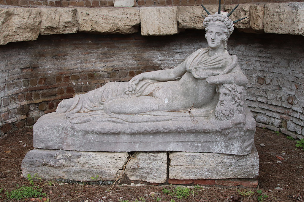 In the apse is a plaster cast (the original is in the Vatican Museums) of a statue of a reclining Attis, after the emasculation. In his left hand is a shepherd's crook, in his right hand a pomegranate. His head is crowned with bronze rays of the sun and on his Phrygian cap is a crescent moon. This suggests astrological aspects: Attis was regarded as a solar deity and identified with the moon-god Men. He is leaning on a bust, probably the personification of the river Gallos, where he had died. His posture is reminiscent of river gods (the river Gallos), but the statue also brings to mind sarcophagi, with a depiction of the deceased on the lid. The statue is a dedication by Caius Cartilius Euplus, witness the inscription on the plinth: