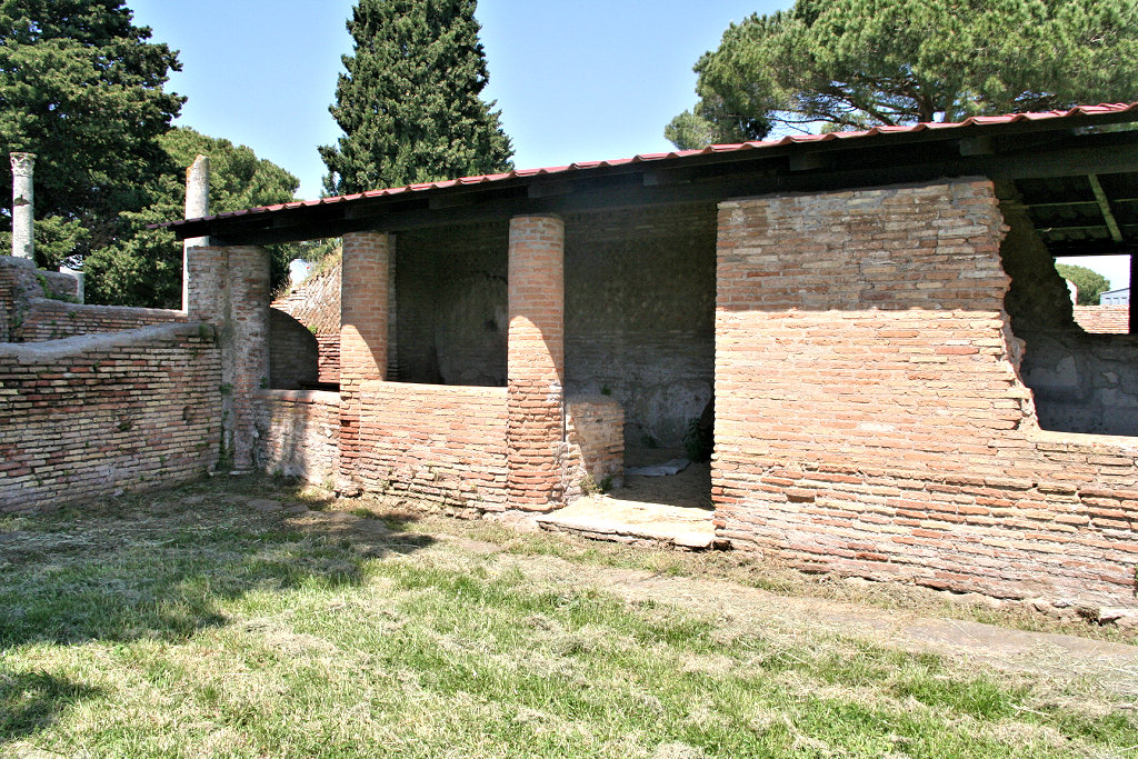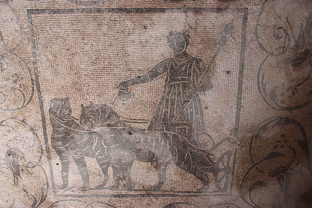 At the end of the second century AD four small rooms were installed in the north-east corner of the Courtyard of Dionysus. In room A brick columns of a republican domus were reused. Room B could be entered from the courtyard. In room D is the black-and-white mosaic that gave the building its name. In the four corners are Dionysiac figures. In the centre is the young Dionysus, in a chariot drawn by tigers.  |