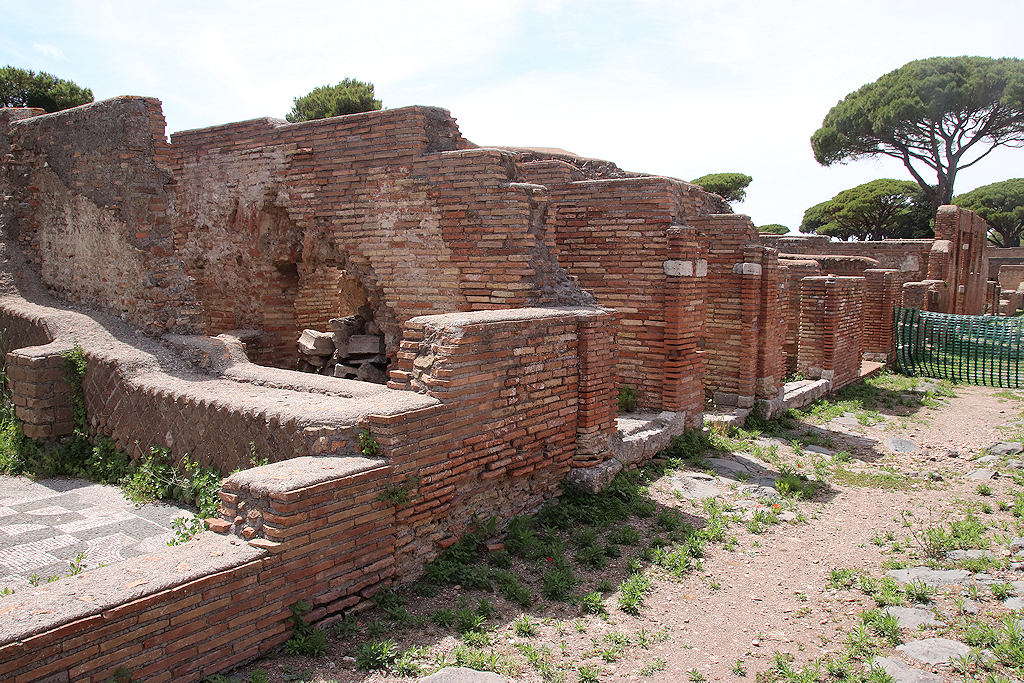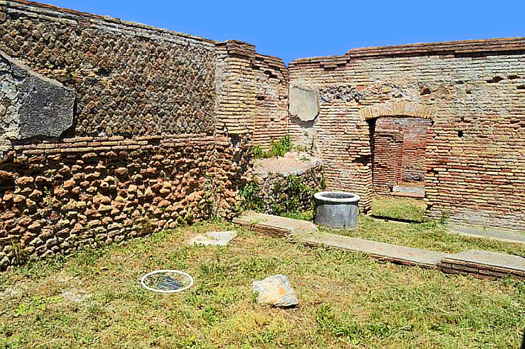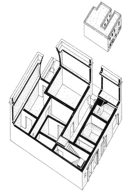 This is a small, but very interesting house, measuring 13.50 x 14.50. The building was erected in the Severan period (c. 200 - 235 AD; opus latericium and mixtum). Alterations have been dated to c. 250 AD. In the facade are four doorways. Two brick pilasters, which must have carried a brick pediment, frame the doors of entrance-corridor 1 and staircase 2a. Wide doorways lead to shops 14 and 15, with floors of opus spicatum. Traces in the east wall of room 3, to the south of the staircase, indicate that a latrine was installed here. The entrance-corridor and the shops were covered by barrel vaults. Shop 15 eventually became a separate unit. The central room of the building is area 13, that did not have a ceiling. It was an important source of light. At the north end is a well with a marble well-head. A bench with a niche was set against the north wall. The area has a simple black-and-white mosaic floor. On the walls red lines were painted, as in the shops. A side-entrance leads to room 4, to the south of area 3. In the rear part of the building we encounter central hall 7. It is flanked by rooms 8 and 12, the main living and reception rooms. In the east wall of room 12 were three windows, later converted into a wide doorway. This room was two storeys high. Below the floor is a cistern. Room 11, in the north-west part of the building, has a barrel-vault with a skylight (store-room? shrine?). The other rooms in the rear part had ceilings resting on wooden beams. A staircase above room 3, in the south-east part of the building, led to apartments above the front part of the building. Staircase 2a, reached from the street, led to a separate apartment above the rear part.  |