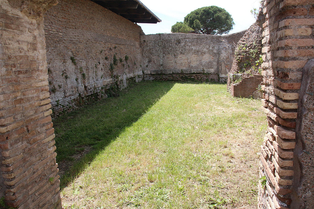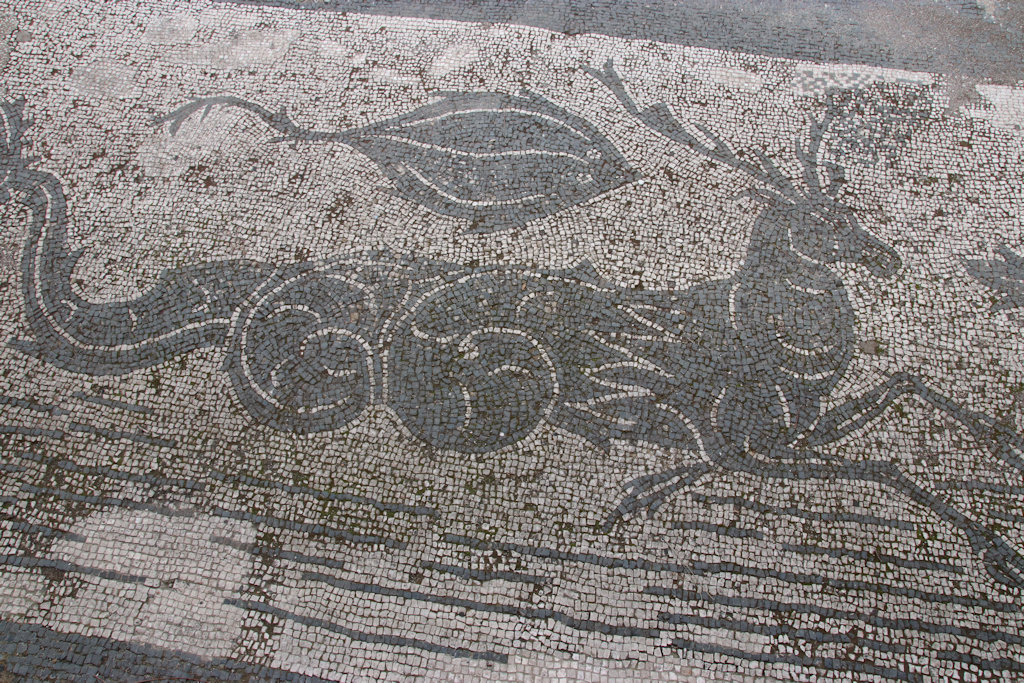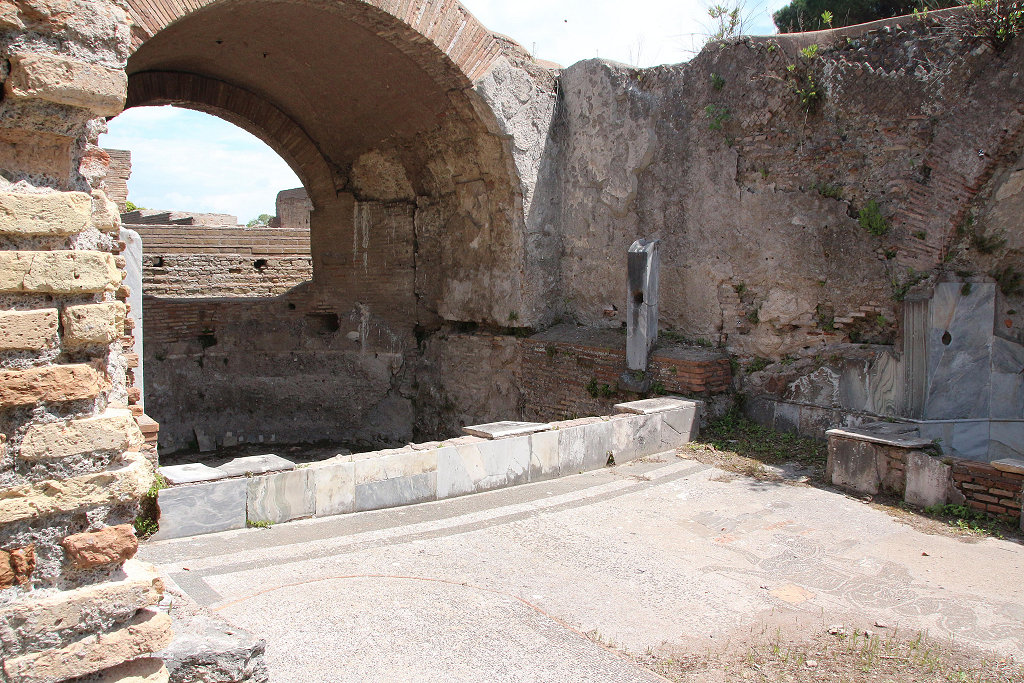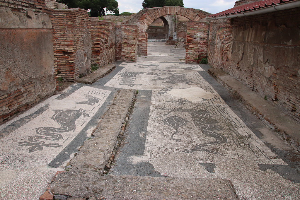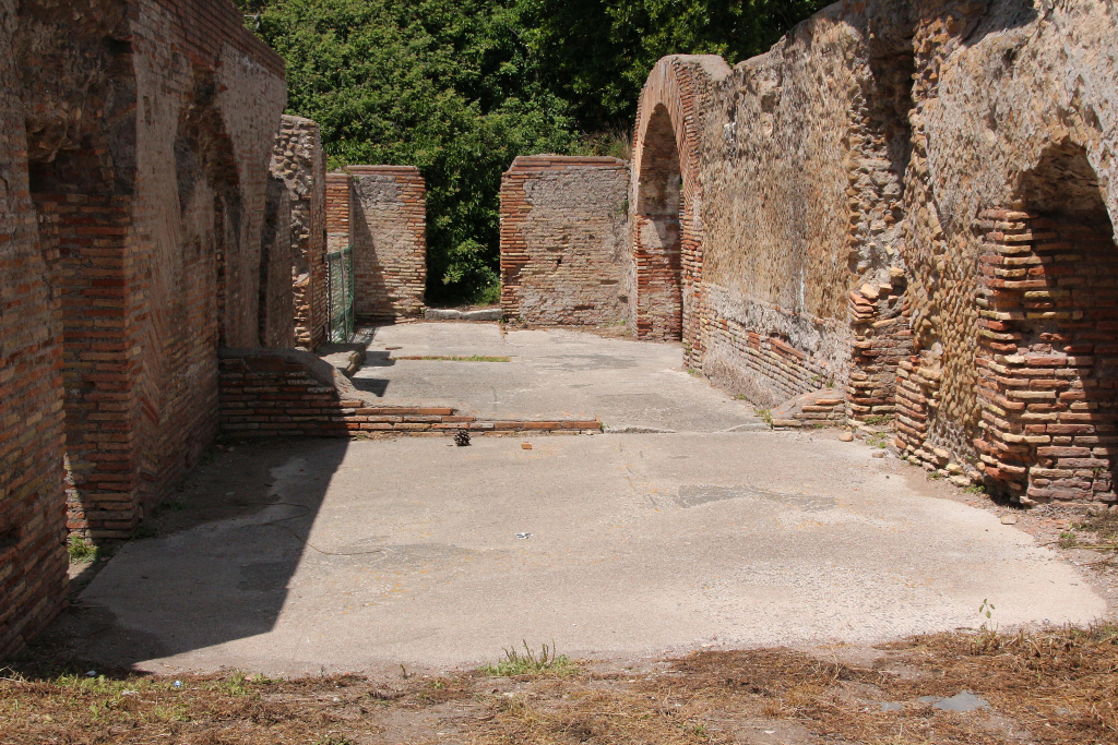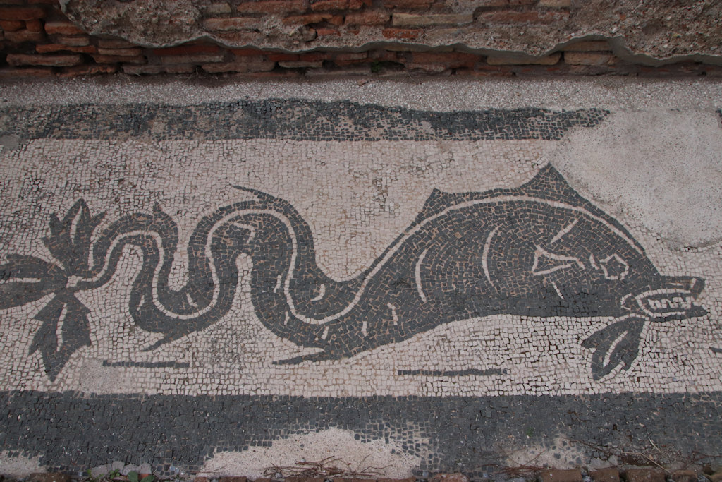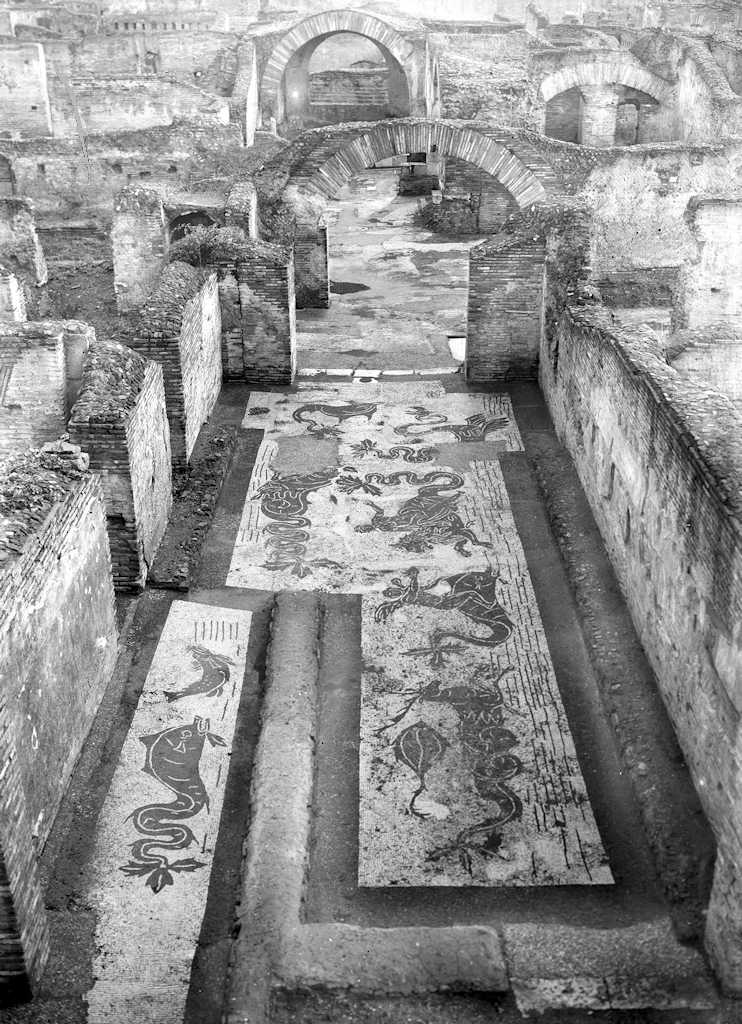 The Baths of the Jealous One were named after a text in a mosaic in a shop to the south-west (V,V,1). They were built c. 50 AD (opus reticulatum). Modifications have been dated to the period of Antoninus Pius (opus latericium). The paintings and black-and-white mosaics have been dated to the first half of the third century. The latest masonry in the building belongs to the early fifth century. To the north of fish shops V,V,1 is vestibule A, that was reached from the Semita dei Cippi through a porticus. On the floor is a mosaic with a marine scene. To the east of the fish shops is another vestibule, reached from Via dell'Invidioso (B). Here is a mosaic with a Nereid on a hippocamp. Room C was a dressing room (apodyterium). In the south and west wall the niches can be seen in which the clothes were put away. The niches were later blocked with bricks. Room D was a cold bath (frigidarium), with apses with basins in the south and east part. On the floor is a mosaic of an amorino riding a marine tiger. The apse in the east part has a large window giving onto Via del Sole. The road was partly blocked by the apse, built in the last quarter of the third century. Further to the north are the heated rooms (E, F, G, H), that were modified in the first quarter of the fifth century. To the west is the palaestra (J). The palaestra could also be reached from the Decumanus Maximus, through corridor K. Room L was a bar, that could be reached from the street (Via del Sole) and the apodyterium. The remains of the bar counter are in the north-east corner. In the east wall is a filled-in cult niche. In the south-east corner of the block (M) were basins and waterwheels. On the north wall of M is a drip stone, as seen in caves.