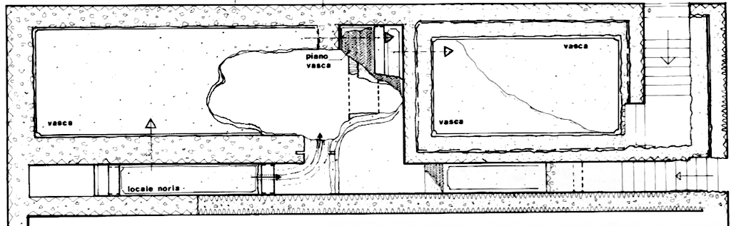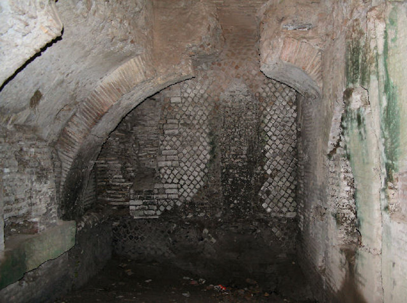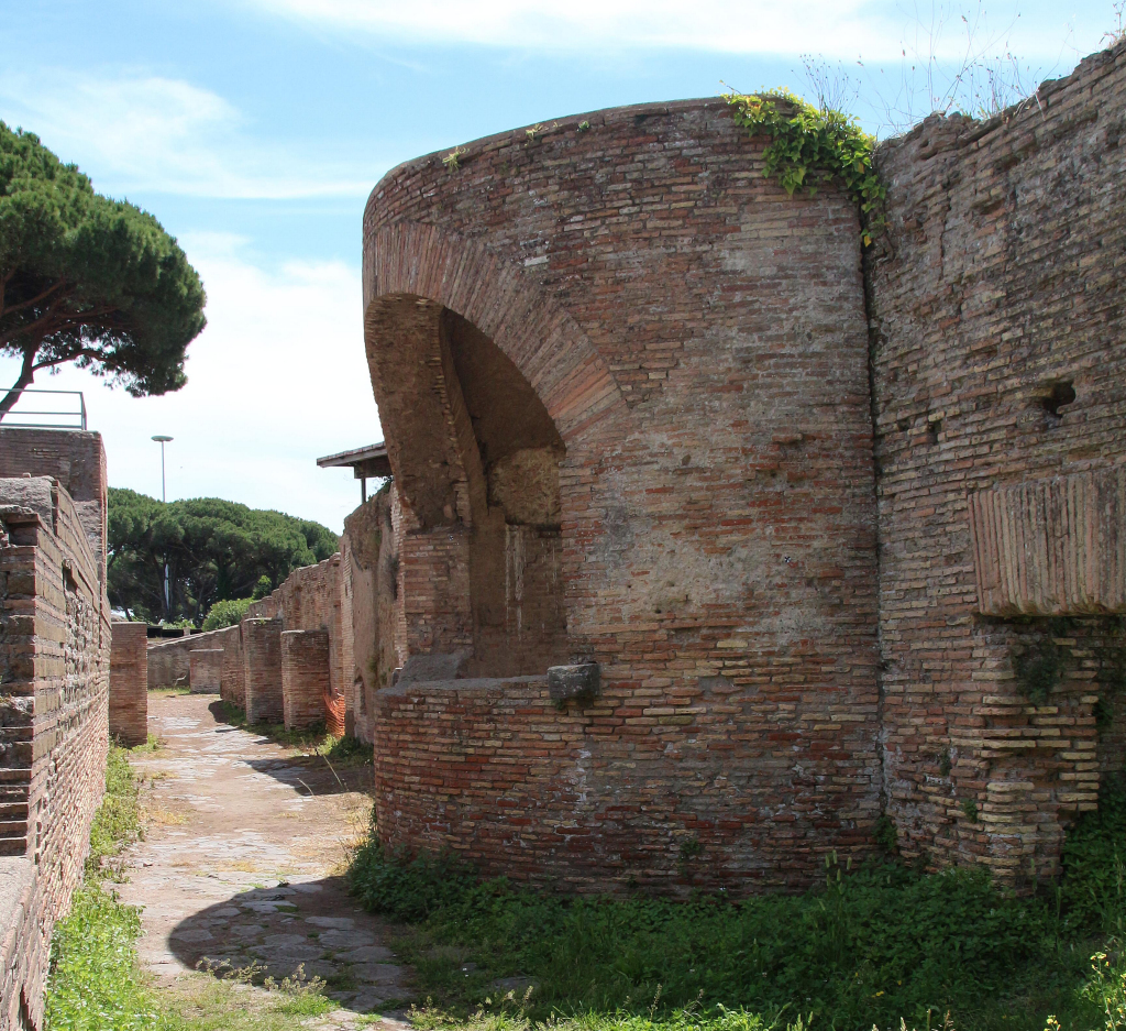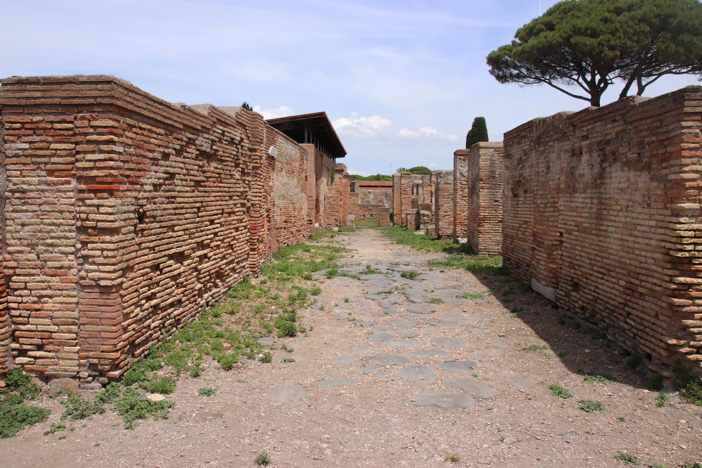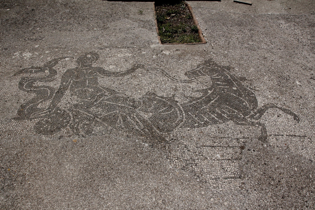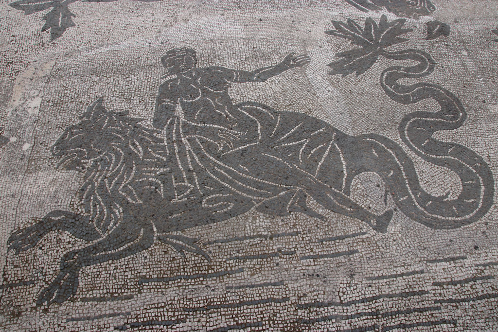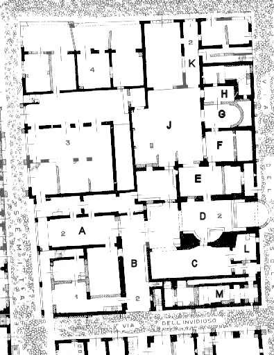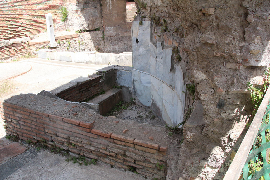 The Baths of the Jealous One were named after a text in a mosaic in a shop to the south-west (V,V,1). They were built c. 50 AD (opus reticulatum). Modifications have been dated to the period of Antoninus Pius (opus latericium). The paintings and black-and-white mosaics have been dated to the first half of the third century. The latest masonry in the building belongs to the early fifth century. To the north of fish shops V,V,1 is vestibule A, that was reached from the Semita dei Cippi through a porticus. On the floor is a mosaic with a marine scene. To the east of the fish shops is another vestibule, reached from Via dell'Invidioso (B). Here is a mosaic with a Nereid on a hippocamp. Room C was a dressing room (apodyterium). In the south and west wall the niches can be seen in which the clothes were put away. The niches were later blocked with bricks. Room D was a cold bath (frigidarium), with apses with basins in the south and east part. On the floor is a mosaic of an amorino riding a marine tiger. The apse in the east part has a large window giving onto Via del Sole. The road was partly blocked by the apse, built in the last quarter of the third century. Further to the north are the heated rooms (E, F, G, H), that were modified in the first quarter of the fifth century. To the west is the palaestra (J). The palaestra could also be reached from the Decumanus Maximus, through corridor K. Room L was a bar, that could be reached from the street (Via del Sole) and the apodyterium. The remains of the bar counter are in the north-east corner. In the east wall is a filled-in cult niche. In the south-east corner of the block (M) were basins and waterwheels. On the north wall of M is a drip stone, as seen in caves.