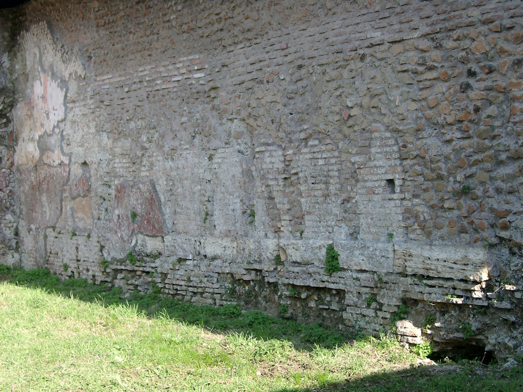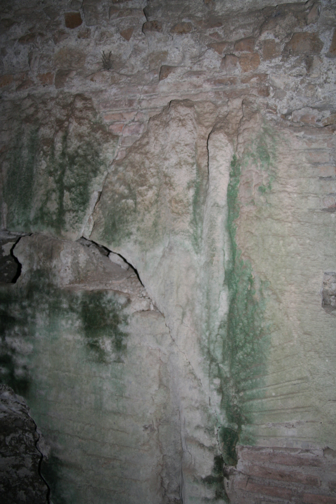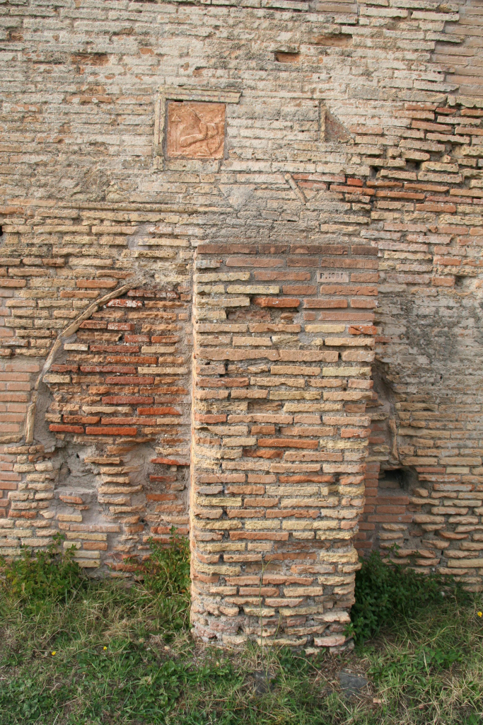 Three brick piers were set against the south facade, belonging to arches that spanned the road. Behind the westernmost one are a few strange decorative elements, from bottom to top: |
