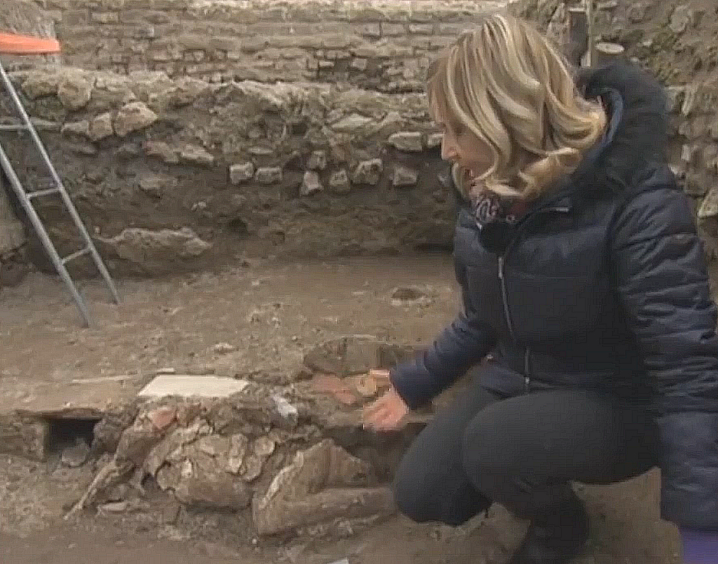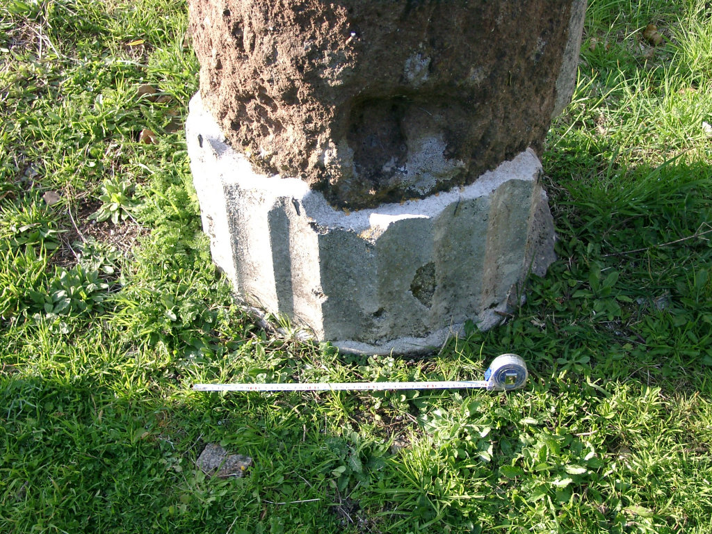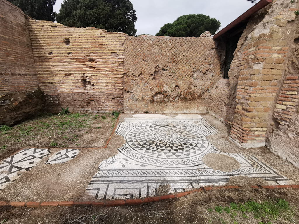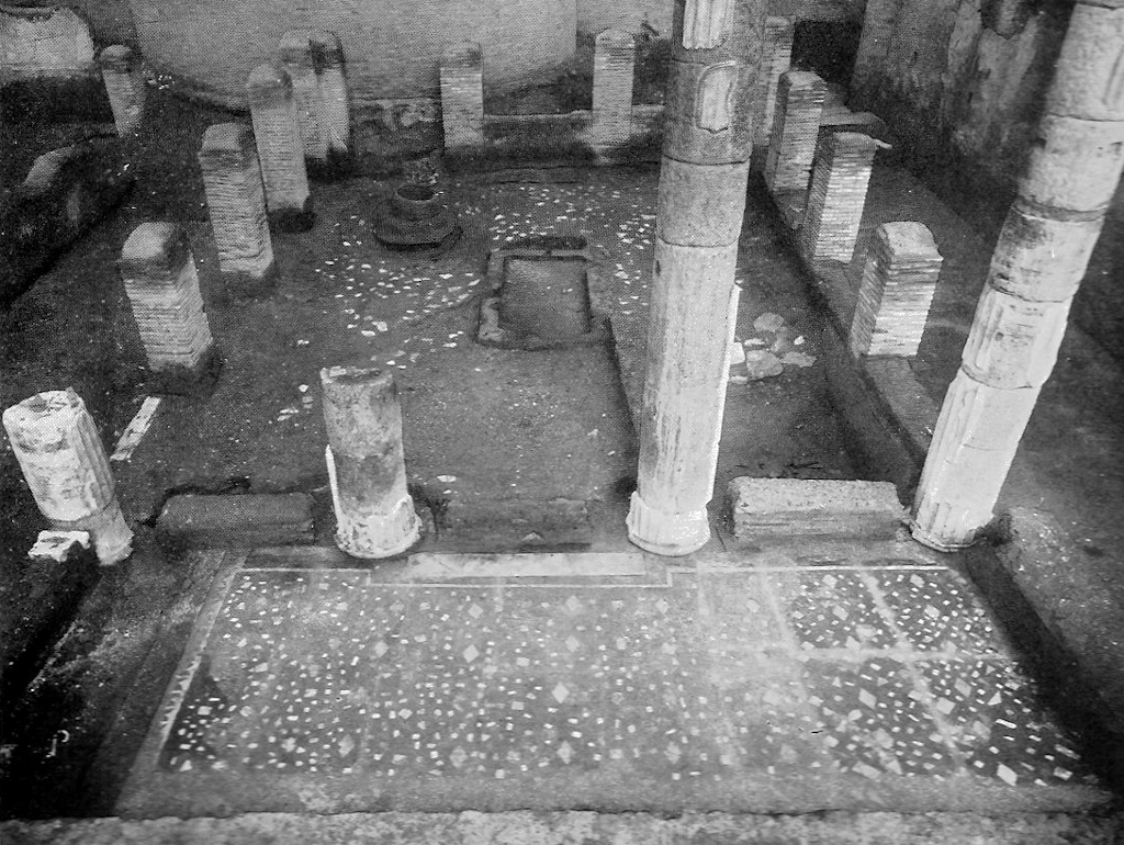 The House of the Stuccoed Capitals was a rich house, a domus, built in the second century BC. Today only the peristylium can be seen. Most of the building was replaced by the Seat of the Augustales (V,VII,1-2) to the north. Furthermore an apse from the late third century invaded the space of the peristylium. The main entrance to the remaining part of the domus is from the south, through what was once the tablinum. In the peristylium was a porticus of tufa columns, except for the corners, where travertine columns are found. Most of the columns were later replaced by brick piers. The columns were decorated with stucco imitating fluting. The peristylium could also be reached through a corridor to the west. Doors in the south wall of this corridor lead to some rooms in the south-west corner of the block: shops and backrooms. They were built in the Antonine or Severan period. The ambulacrum of the peristylium was decorated with a geometric black-and-white mosaic in the middle of the third century. During further excavations in 2022 part of a stucco relief of Mithras was found in the building. The early reports say: "The interpretation of this stucco relief as a representation of the god Mithras in the act of sacrificing the bull was supported by the continuation of the excavation which, in addition to producing numerous other stucco fragments, led to the identification of the room in which it was found as a mithraeum".  |