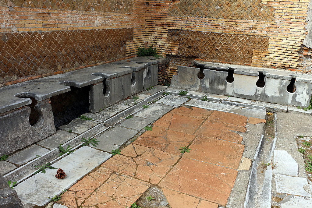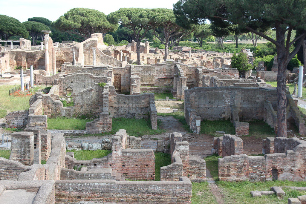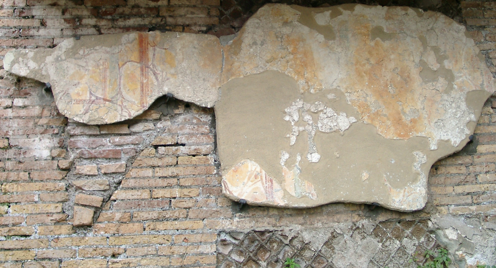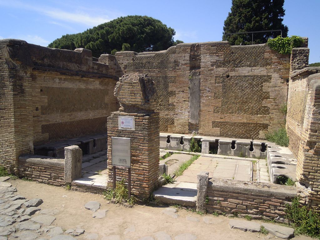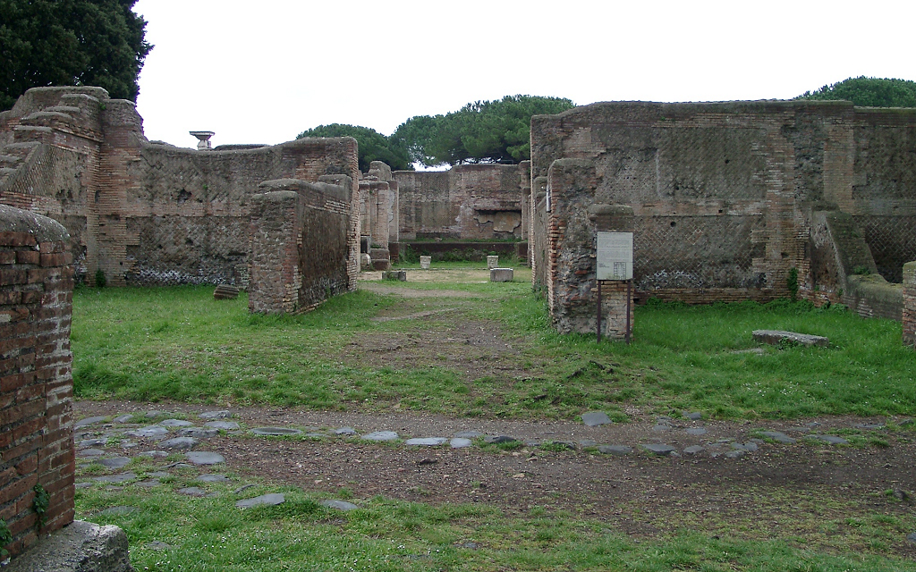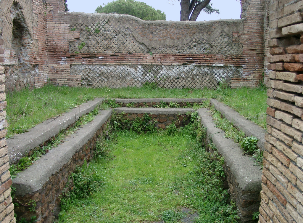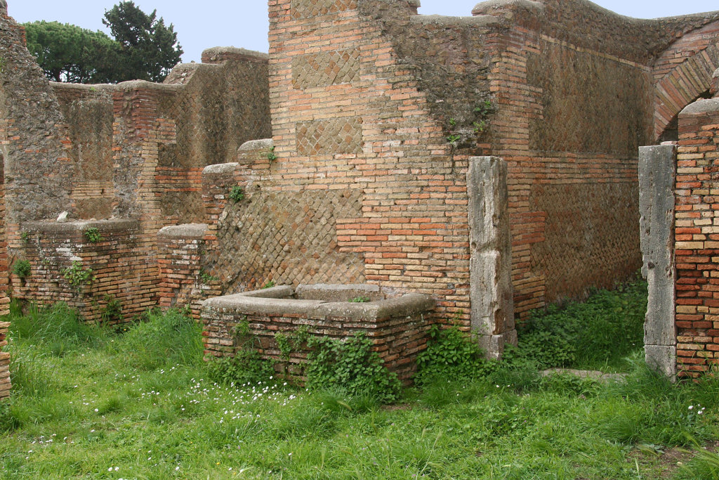 To the east of the southern half of the Forum is the guild seat of the builders (fabri tignuarii). It was erected during the reign of Hadrian, c. 120 AD (excellent opus mixtum). In the courtyard is the base of a statue, with a dedication to Septimius Severus (198 AD) and, on one of the sides, a list of c. 350 members of the guild. It was found in the building. Both the architecture and the inscription led to the identification as guild seat. The position of the building, close to the Forum, strongly emphasizes the importance of the builders' guild. A vestibule in the north part of the building is reached from the Decumanus Maximus. On either side are two shops, with an external staircase to the west. Behind the vestibule is a courtyard, surrounded by a porticus with brick piers, and marble columns on the short sides. It is paved with a white mosaic. Walls were built between some of the piers at a later date. The porticus has a floor of opus spicatum. The north wing is wider than the other sides. To the north-west of the porticus is an internal staircase. The entrance of the room next to it (the understairs) has thick, travertine jambs. For such jambs only a few parallels can be found in Ostia. Apparently the room was of special significance. Archives may have been stored here for example. Next to the entrance of the understairs is a water basin. Four rooms to the east of the courtyard contain masonry dining-couches (triclinia), which gave the building its modern name. They were used during communal meals of the leading men in the guild. In the southernmost room a basin was later installed. In the room to the south is a staircase, below which is a small latrine. To the west of the courtyard we find the internal staircase and a row of rooms, presumably including a kitchen. These rooms have not only doorways but also windows opening onto the porticus of the courtyard. Behind the courtyard is a large room that, at an unknown date, was transformed into a shrine, probably for the cult of the Emperors. It must have been higher than the other rooms and had a barrel vault. Along the walls runs a podium (h. 1.10, d. 1.00), on which votive offerings or statues were placed. Remains of paintings have been preserved that imitate yellow marble (probably from the end of the third or the beginning of the fourth century). The pavement was made of marble of different colours. Apart from the inscription from 198 AD the following objects were found in the building: a statue, possibly of the nymph Leukothea; a huge head of Minerva; a dedication to Mars (reused in the marble decoration of the podium in the shrine). Mars may have been the protective deity of the builders, who were organized in a military way. The ordinary members were called caligati: booted soldiers. The reason may have been that they were used as fire-fighters, supplementing the regular fire-brigade (vigiles). Guild Temple V,XI,1 was the main temple of the guild. In the south-west part of the building are more shops and a staircase. In the south-east corner is an independent, large public latrine (forica), accessible from Via della Forica. It replaced two shops, possibly in the fourth century (in the north wall traces can still be seen of the original dividing wall). There are twenty marble seats and a little basin. From holes in the thresholds can be deduced that the entrances had revolving doors. To the east of the latrine, on the Forum of the Heroic Statue, was a large cistern that supplied water to the latrine and the rest of the building, and to the Baths of the Forum. |