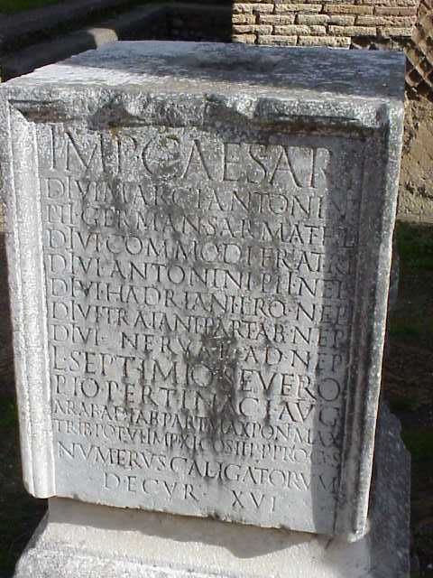 IMP(eratori) CAESARI DIVI MARCI ANTONINI PII GERMAN(ici) SARMAT(ici) FIL(io) DIVI COMMODI FRATRI DIVI ANTONINI PII NEP(oti) DIVI HADRIANI PRONEP(oti) DIVI TRAIANI PART(hici) ABNEP(oti) DIVI NERVAE ADNEP(oti) L(ucio) SEPTIMIO SEVERO PIO PERTINACI AVG(usto) ARAB(ico) ADIAB(enico) PART(hico) MAX(imo) PONT(ifici) MAX(imo) TRIB(unicia) POT(estate) VI IMP(eratori) XI CO(n)S(uli) II P(atri) P(atriae) PROCO(n)S(uli) NVMERVS CALIGATORVM DECVR(iarum) XVI |
