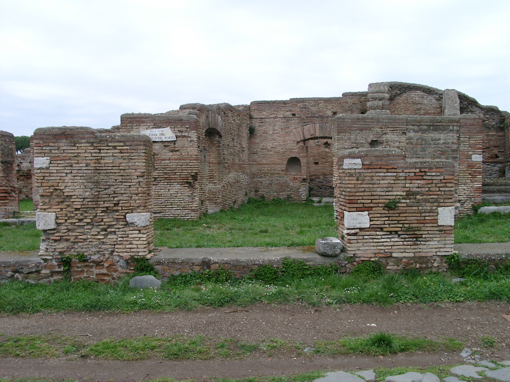 The House of the Harbour Mosaic was built during the reign of Commodus (yellow opus latericium with red bonding courses). Alterations have been dated to the first half of the third century.