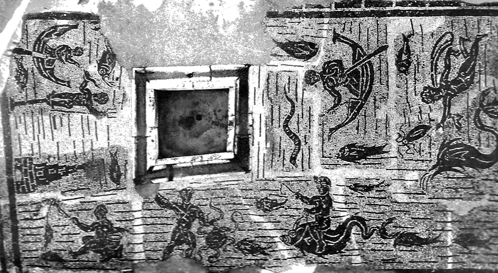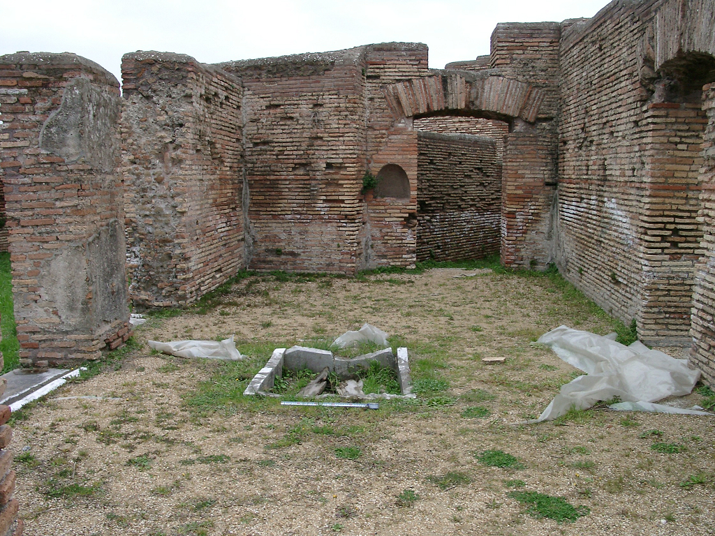 The rooms in the west part are all interconnected. In the back wall of two of these shops is a semicircular cult niche. One of these replaces a wall-niche in the other side of the wall (in the corridor). In the central shop is a black-and-white mosaic that gave the building its name. The mosaic belongs to the third century phase. It shows the harbour of Portus, a statue of Neptunus on a column (the deity is holding a trident and a dolphin), the light-house, fishes, people in boats (one salutes the deity), people fishing, a person on a dolphin and a swimming woman. The mosaic was laid around a square marble basin. The entrance from the porticus to this room has a threshold for two doors. The room to the north had a masonry and a marble basin. Both the mosaic and the basins suggest that fish was sold here, as in the Shops of the Fishmongers (IV,V,1), across the street, and the House of the Jealous One (V,V,1), containing a similar mosaic and a basin.