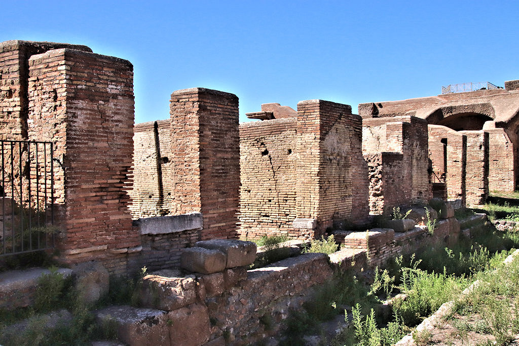 This building consists of two large rooms, both accessible from the street through wide passages, one with a large basin. Two doorways in the back wall (later blocked) suggest that this was a workshop, where the goods sold in the shops to the west (I,VIII,5) were manufactured. It was built during the reign of Antoninus Pius. |