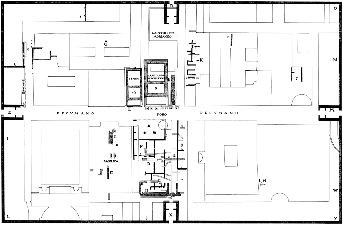 Gates of the Castrum: M-R-X-Z. Temples below the Hadrianic Capitolium: 9-10.
