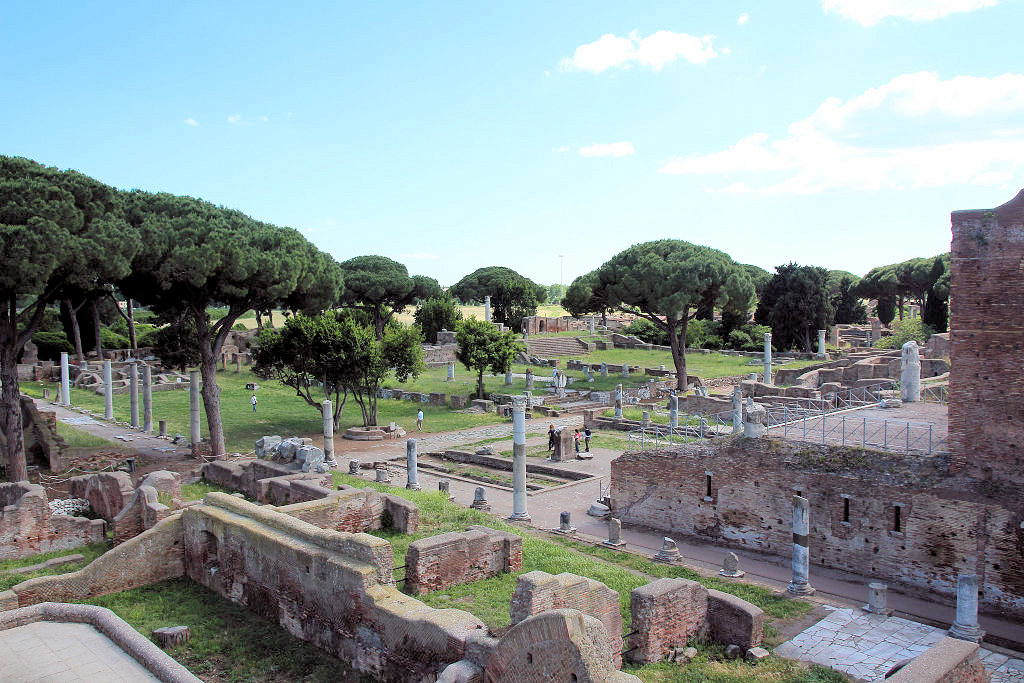 The oldest walls in Ostia belong to the Castrum, a military camp at the mouth of the Tiber, that was probably built in the early third century BC. The walls were made of large tufa blocks. Later they were for the most part demolished, but a few stretches were reused in later buildings. A good example can be seen to the west of Via dei Molini. The fort was rectangular. The main roads inside were called Decumanus and Cardo, running west-east and north-south respectively. There was a gate in each side of the camp. Remains of the eastern gate gate can be seen in a large dip in the Decumanus. The Forum, the main square of the city at the intersection of the Cardo and Decumanus, is mentioned for the first time in an inscription from the second half of the first century BC. A local citizen, Publius Lucilius Gamala, erected a marble tribunal on the Forum, a raised platform used by magistrates acting as judges. Most of the Forum has been excavated deeper down, to explore the early phases of Ostia. The remains of two early temples were then found. The larger one, from the early reign of Augustus, was probably the Capitolium, dedicated - like the Capitolium in Rome - to Jupiter, Juno and Minerva. Most likely it replaced an earlier aedem Iovis, temple of Jupiter, that was according to Livius struck by lightning in 199 BC. Next to the Capitolium was a smaller temple, built around the middle of the first century BC. Its deity has not been identified. On the south part of the square a temple of Roma and Augustus was erected during the reign of Tiberius (14-37 AD). At the end of the first century or in the early second century AD, a Basilica was added to the west and further north the Curia, the meeting hall of the city council and the mayors. During the reign of Hadrian (117-138 AD) the majestic Capitolium, dominating the square today, was built. It replaced the two earlier temples. From the north and south only pedestrians could enter the square. The Decumanus on the other hand continues across the square. To the south of this road, more or less in the centre of the square, is an enigmatic small, round structure. The square was covered with a layer of concrete, but it is not known what finishing stone was on top. On the west and east side are Hadrianic porticoes with granite columns and marble pavement, three steps above the Forum. From the north-east portico three rooms and a staircase can be accessed, from the south-east portico a niche with a statue. To the west of the Temple of Roma and Augustus is a row of shops. The Forum was probably adorned with a statue of Ancus Marcius, king of Rome (640-616 BC) and according to many ancient authors founder of the colony of Ostia. The inscription belonging to this statue was found in a sewer below Via dei Molini: