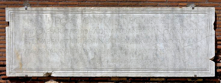 DECVRIONVM DECRETO IMP(eratori) CAESARI T(ito) AELIO HADRIANO ANTONINO AVG(vsto) PIO P(atri) P(atriae) ET DIVAE FAVSTINAE OB INSIGNEM EORVM CONCORDIAM VTIQVE IN ARA VIRGINES QVAE IN COLONIA OSTIENS(i) NVBENT ITEM MARITI EARVM SVPPLICENT |