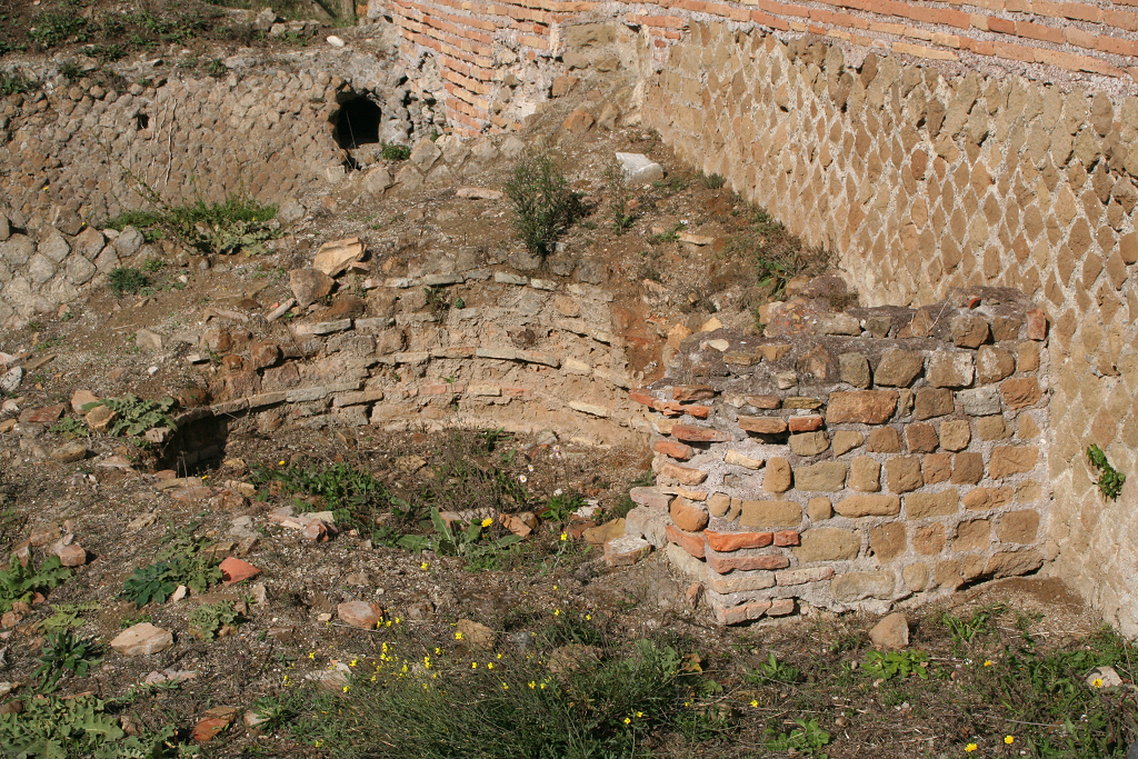 The building is today almost completely filled with earth and overgrown. It is to the north and west of the Four Small Temples (II,VIII,2). It was excavated in the years 1885-1886 by Rodolfo Lanciani. Surprisingly (in view of the proximity of the temples) this seems to have been an industrial building, like buildings II,VIII,8 and 9. An oval structure in the north-east part may have been a basin. In the south-west part a long basin is found (5.30 x 0.68) that had marble revetment on the inside. The building is probably Hadrianic. It has been suggested that it was a fulling mill, but there is no good evidence to support this interpretation.