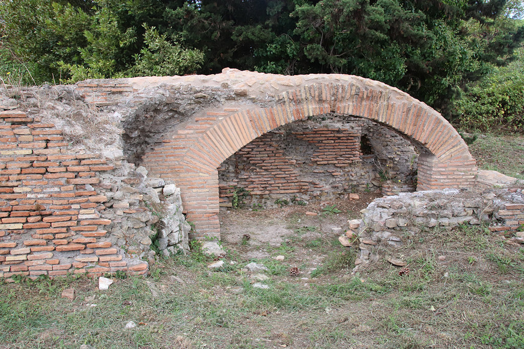 This building, partially excavated at the end of the 19th century, is directly to the east of the Great Warehouse (II,IX,7), across the road. The walls are of Hadrianic opus mixtum. In the centre of the building is a large round structure. The scanty remains consist of a tufa circle, without podium. It has been suggested that it was a basin and that the building was a fulling mill.