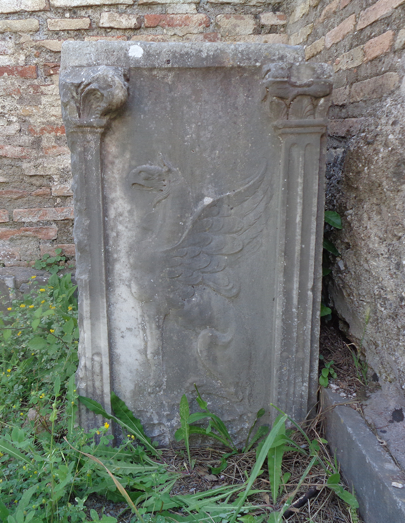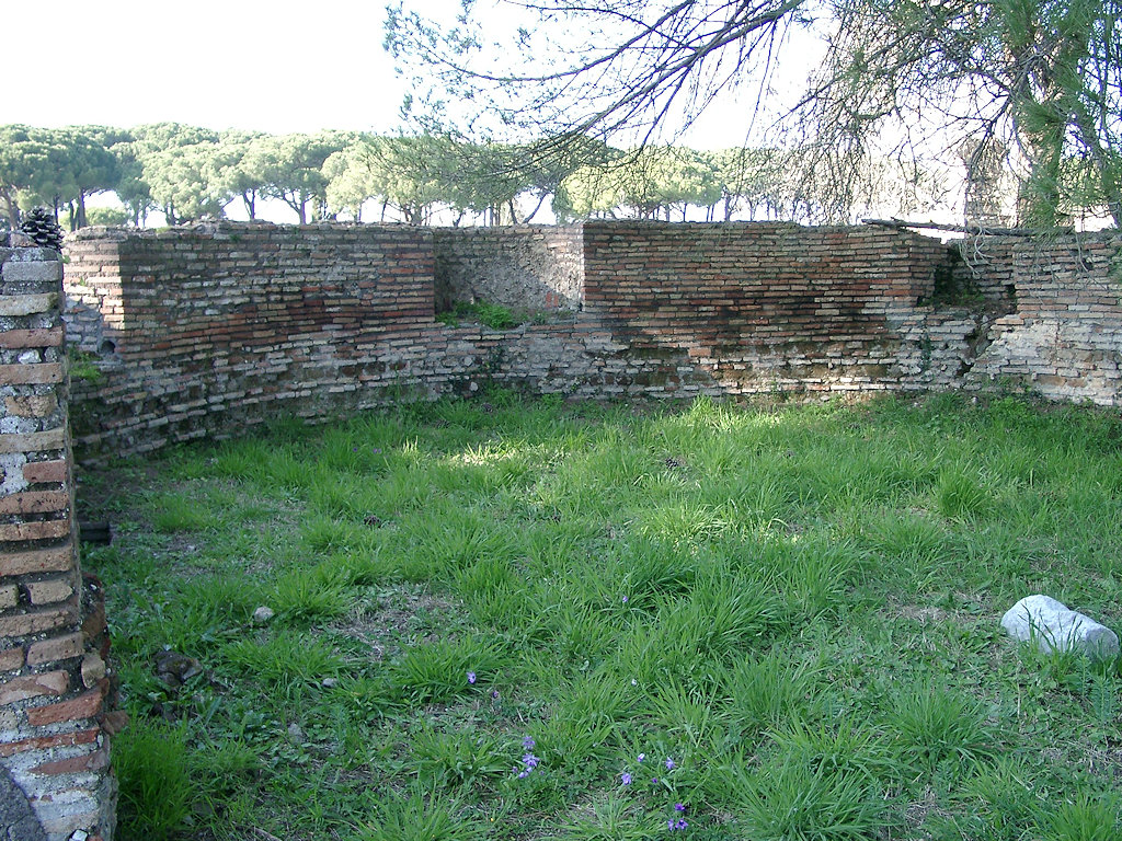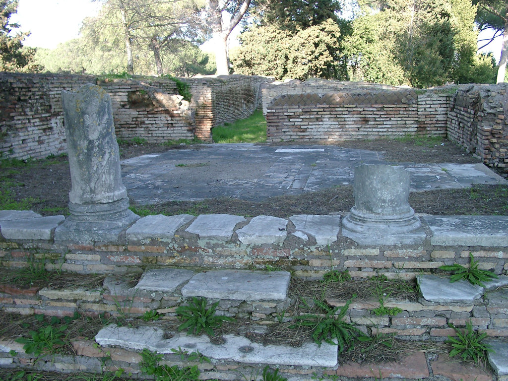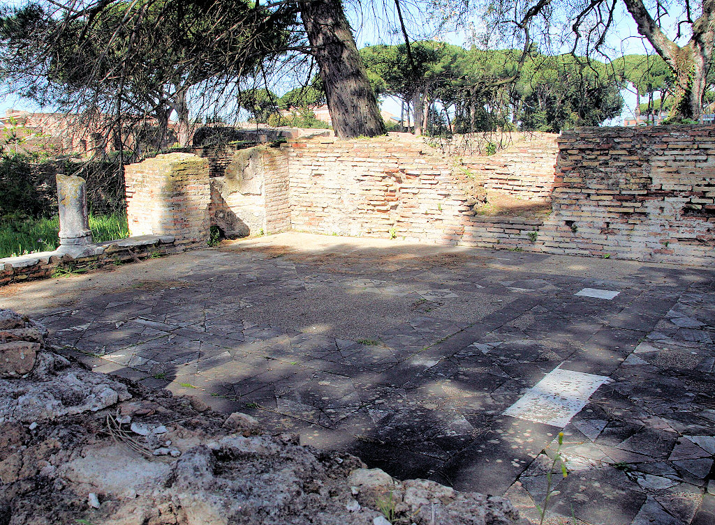 | The Hall of the Group of Mars and Venus was installed in the middle of the fourth century to the north of the Hadrianic shops II,IX,2 (opus latericium and vittatum). In the central north part a large apse was built, with a semicircular niche flanked by two rectangular ones. This was a nymphaeum. Several traces of the water supply were found, such as holes and water-pipes. Opposite is a small apse with a niche placed off-centre (later blocked). To the east is a room (6.25 x 6.25) at a somewhat higher level (0.70), accessed through a colonnaded entrance with four steps. In the north part of the west wall of this room is a floor-niche. The walls of the building were decorated with marble and plaster. Several rooms have floors of opus sectile. Former shops along the Decumanus also belonged to the building. The one to the south of the raised room has a small wall-niche to the east of the door leading to the raised room (this niche was already present in the shop). A low marble bench ran along part of the walls of this room.