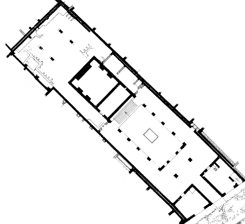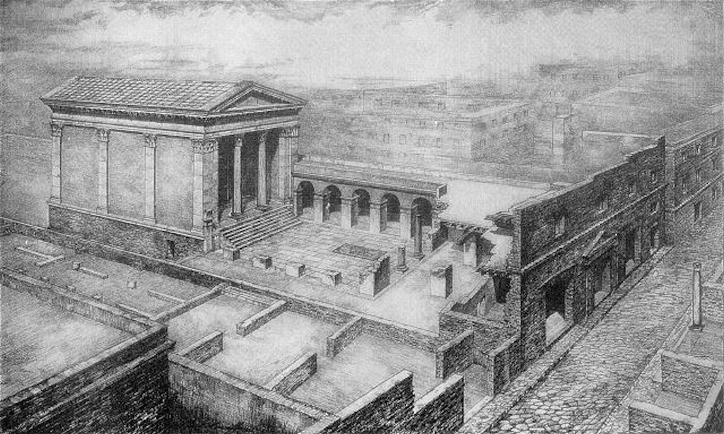 The temple was built on a high podium, and was reached along marble steps. In the front part of the podium, below the pronaos, was a room that could be reached through a door in the left side wall. In front of the temple, in the courtyard, was a rectangular basin. The area behind the temple (c. 16 x 14.50) was flanked by porticoes and could be used by the guild as meeting-hall. |
