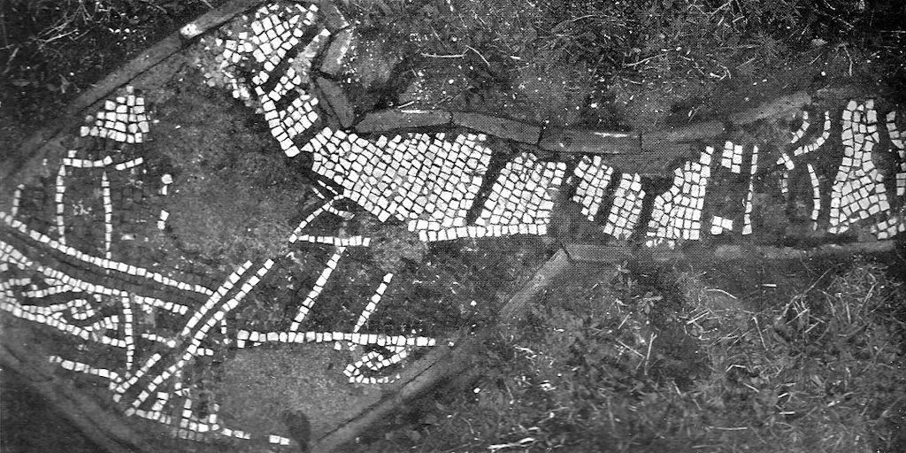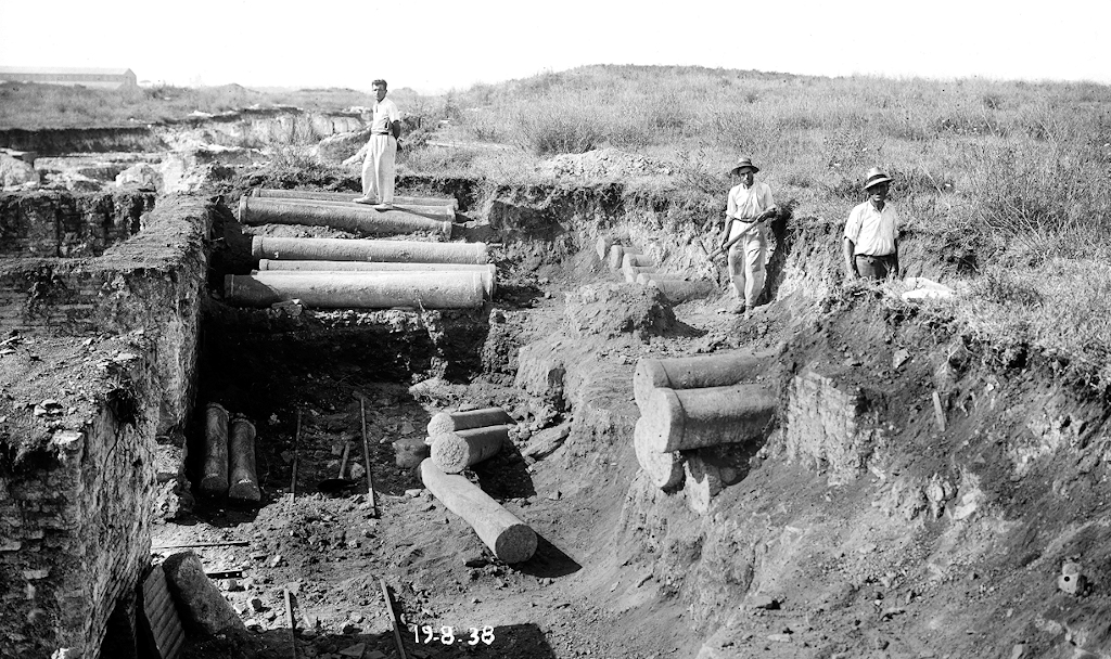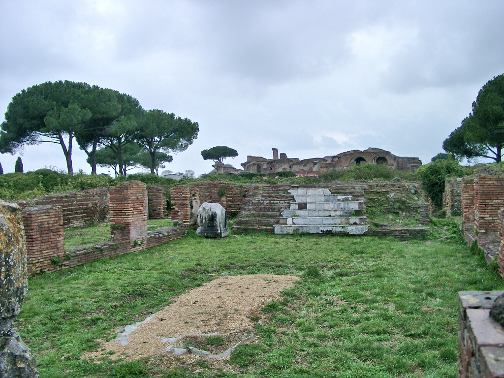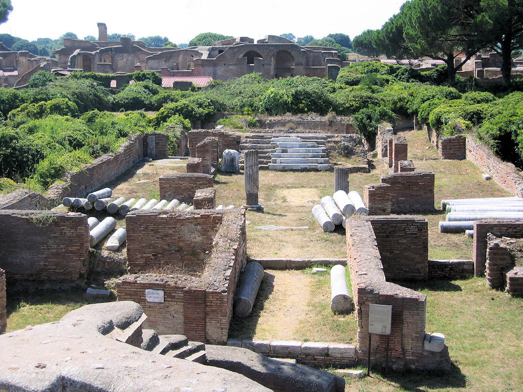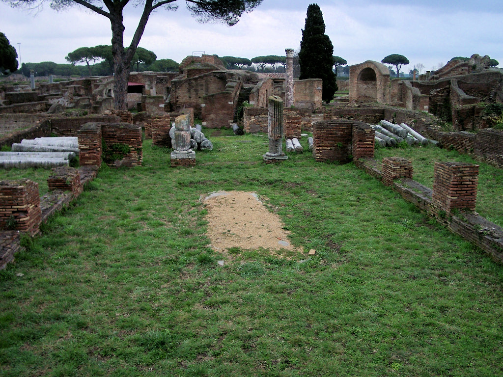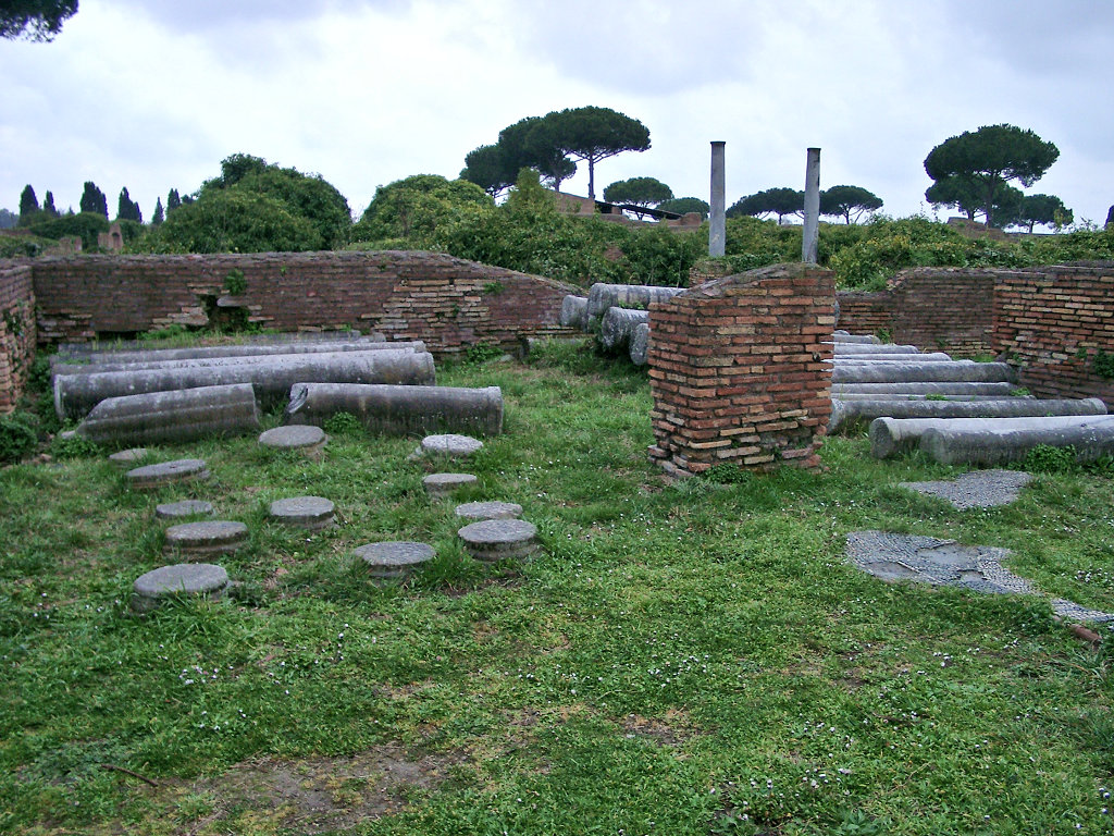 In the front part of the building 47 columns, 20 bases and several capitals were found, not finished yet. They are of marble from the Greek island Thasos. On some of the columns the name Volusianus v(ir) c(larissimus) was found. They belong to the second half of the fourth or the first half of the fifth century: this man was either Caius Ceionius Rufus Volusianus Lampadius, praefectus Urbi in 365-366 AD, or his nephew, praefectus praetorio in 429 AD. He may have lived in the House of the Dioscures (III,IX,1). The columns were stored here to be used in building projects of Volusianus, one of which was the adjacent Christian Basilica, where columns with his name were used. The fact that many columns were never used may be related to an invasion, such as that by Gaeseric and the Vandals in 455 AD. The temple complex was entered through a corridor between two shops. In front of the temple is a courtyard surrounded by a porticus with brick piers. The porticus near the entrance is extra wide, and supported by two additional piers. On the floor of the porticus was a black-and-white mosaic with geometrical motifs and a ship (much damaged). In this part of the building inscriptions were found referring to the guild of the fabri navales, the ship carpenters who built and repaired ships. One of the inscriptions, on a base for a statue, is a dedication to Publius Martius Philippus from 195 AD. He was tribune of the guild in Portus and patron of the guild in Ostia. Ostia and Portus each had its own guild of ship carpenters. The guilds had hundreds of members, which suggests that ships were not only repaired in the harbours, but also built.