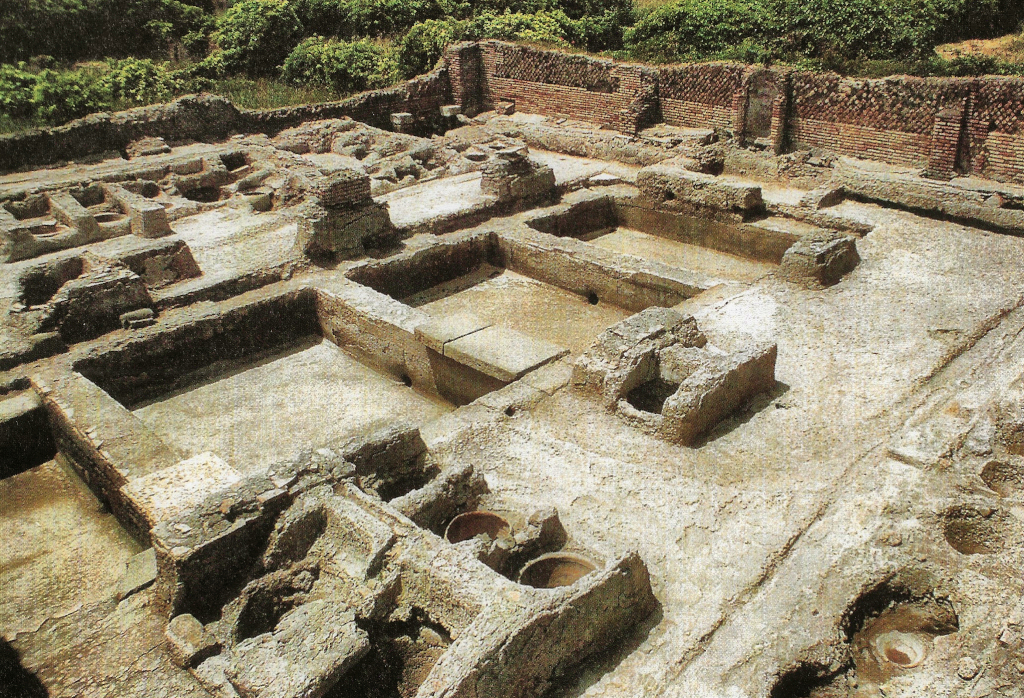 The Temple of the Ship Carpenters was built on top of a fullery. The fullery was excavated in the 1990's, but it had been identified earlier, in 1938-9. It consisted of two courtyards, one behind and one below the temple, surrounded by rooms. The building phases could be dated to the second half of the first and to the second century AD (opus mixtum). It had obviously stopped functioning when the temple was built, during the reign of Commodus. In the floor of the courtyard behind the temple are four very large basins, communicating with one another, and supplied with water through a lead pipe. The fullery contained at least fifty bowls: large pressing-bowls and smaller bowls in which detergents such as the creta fullonica (fuller's earth) were stored. On either side of the pressing-bowls were small walls that were used as hand-rests. There were no bowls along the back wall, where masonry bases were found, used for beating cloth. In the centre of the back wall is a niche, which contained a statue of a deity.