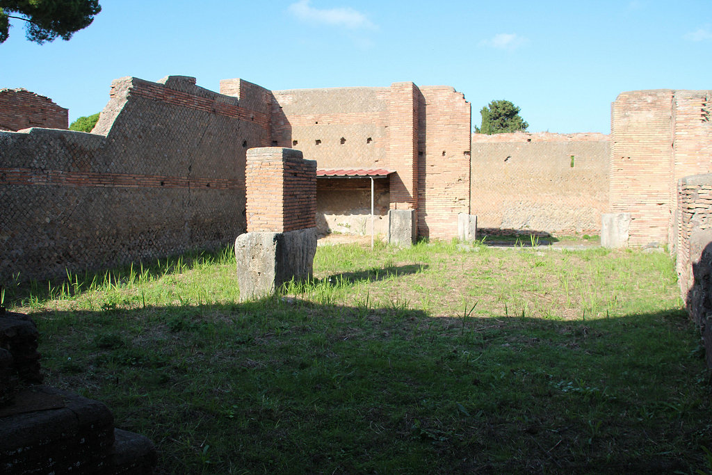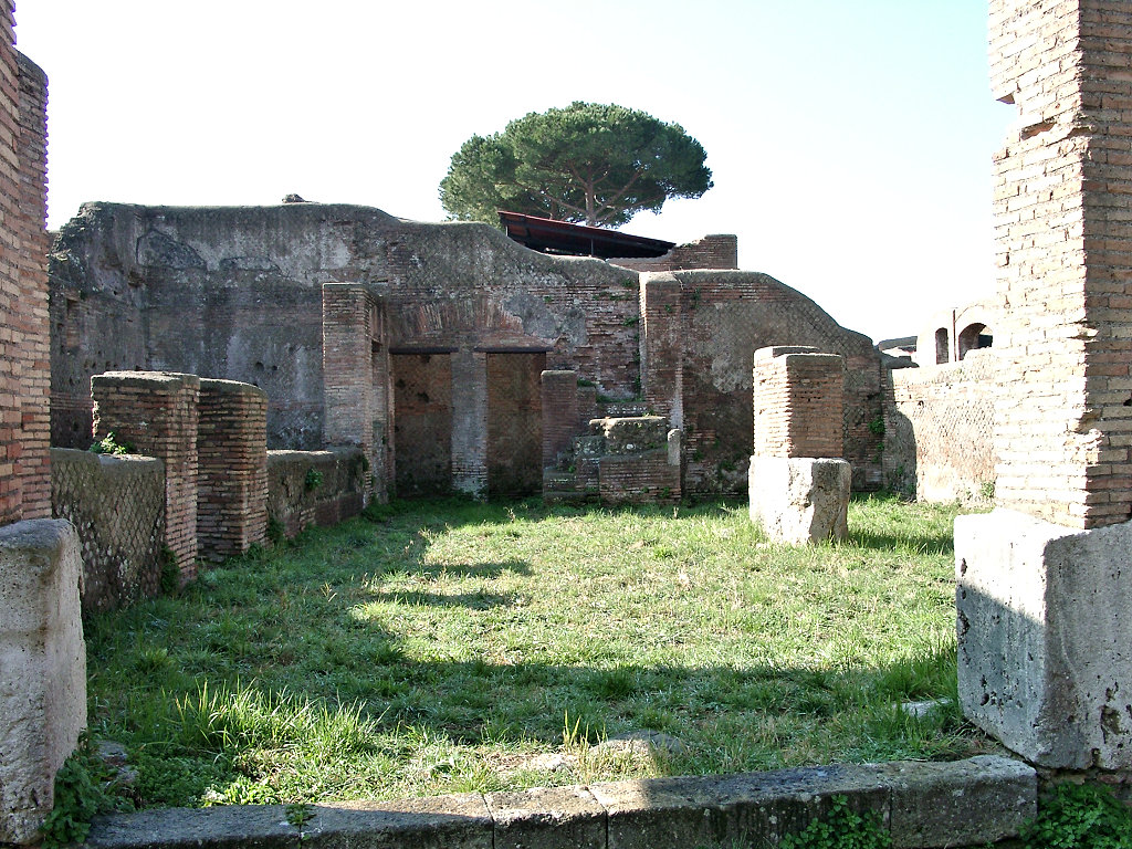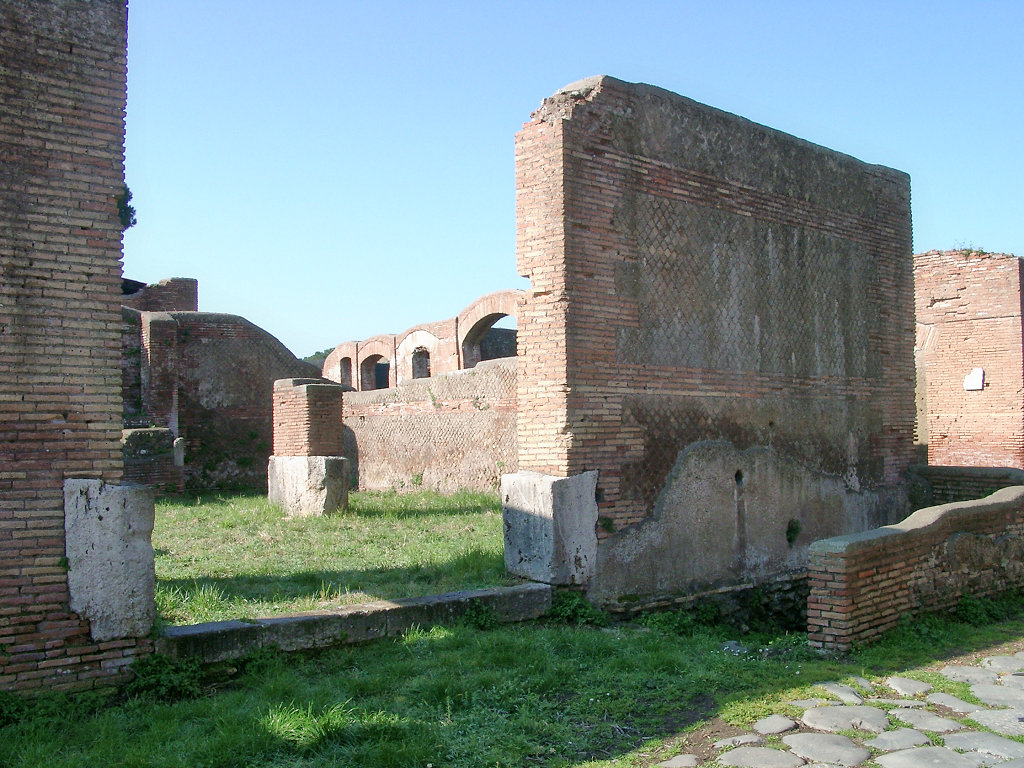The Trapezoidal Building was built in the Hadrianic period (c. 128-130 AD; opus latericium and reticulatum). Outside the building, to the right of the entrance, is a large pit. Water could be taken to it through a hole in the side wall (of the building). In the north-east corner of the building is a shop. Originally there were two doors in the centre of the south-west wall. These were later blocked by a staircase that was set against the south-west facade. The building has a wide entrance at the north side with a travertine threshold and large travertine blocks in the lower part of the jambs. It leads to a wide corridor or courtyard, without a roof. This area was paved with basalt blocks. On either side is a large, covered room. In the back part is a basin that was open on one side. This must have been a stable for the horses of the guests in the hotel in the neighbouring House of the Painted Vaults, and, in view of the size of the building, surely also the stable of the affluent inhabitants of the Garden Houses. On the first floor there will have been accomodation for the servants of the hotel guests. The basin inside the building may have been a trough or provided water for the grooming of the horses. The pit outside the building was a manure pit. |