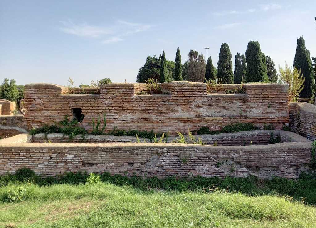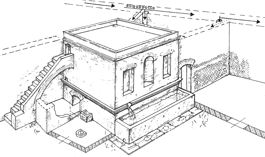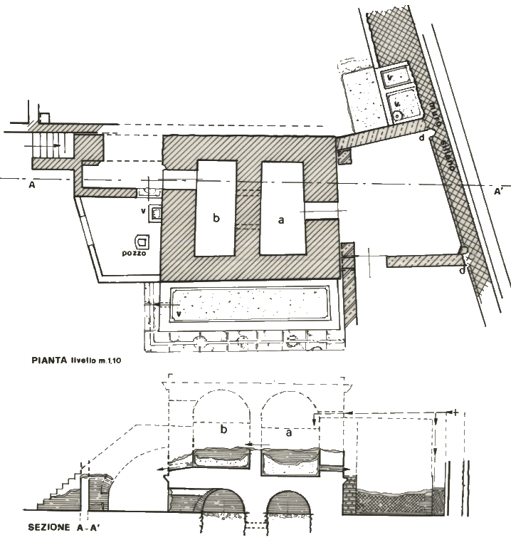 | This public nymphaeum is the monumental facade of a water reservoir. The structure was built in opus latericium and belongs to the Hadrianic period. It probably supplied the fountains in the nearby Garden Houses. The reservoir consists of two lower and two upper rooms. The lower rooms have barrel vaults. They may have been basins, or simply supported the upper rooms. The latter were probably fed by a branch of the aqueduct, that was supported by the republican city wall. Two walls connect the basins and the city wall, that is 4.50 m. to the west. They presumably supported conduits. Furthermore there are two vertical recesses in the city wall, at the point where the two walls begin. They probably contained pipes. On either side of the reservoir is a service area, with a staircase leading to the upper rooms. The nymphaeum has three niches, a semicircular niche in the centre, and two rectangular niches on either side. In front of the niches is a basin that was filled with water through a hole below the left niche. Travertine stones in front of the basin have depressions for buckets. |  Plan of the nymphaeum. After SO I. |