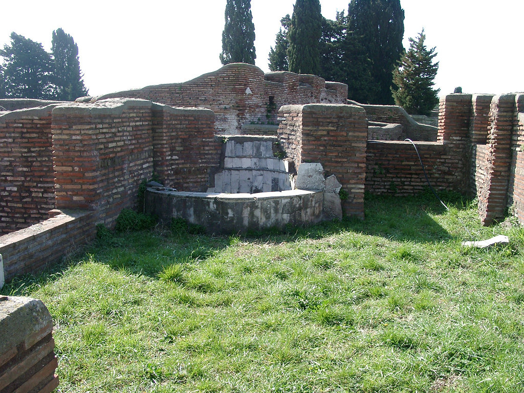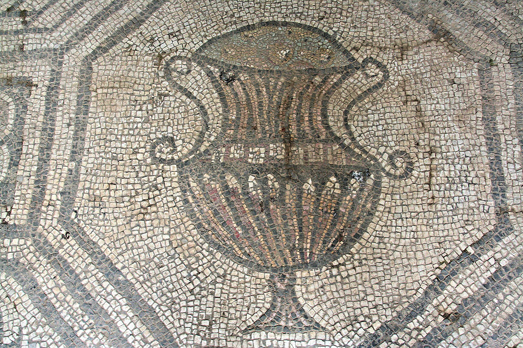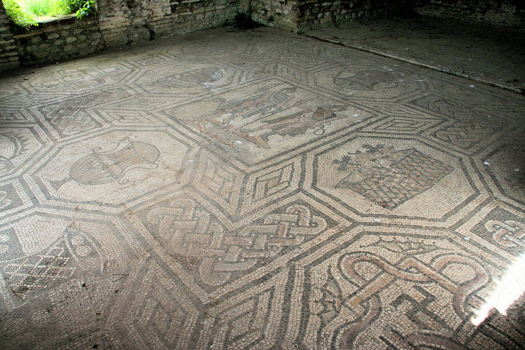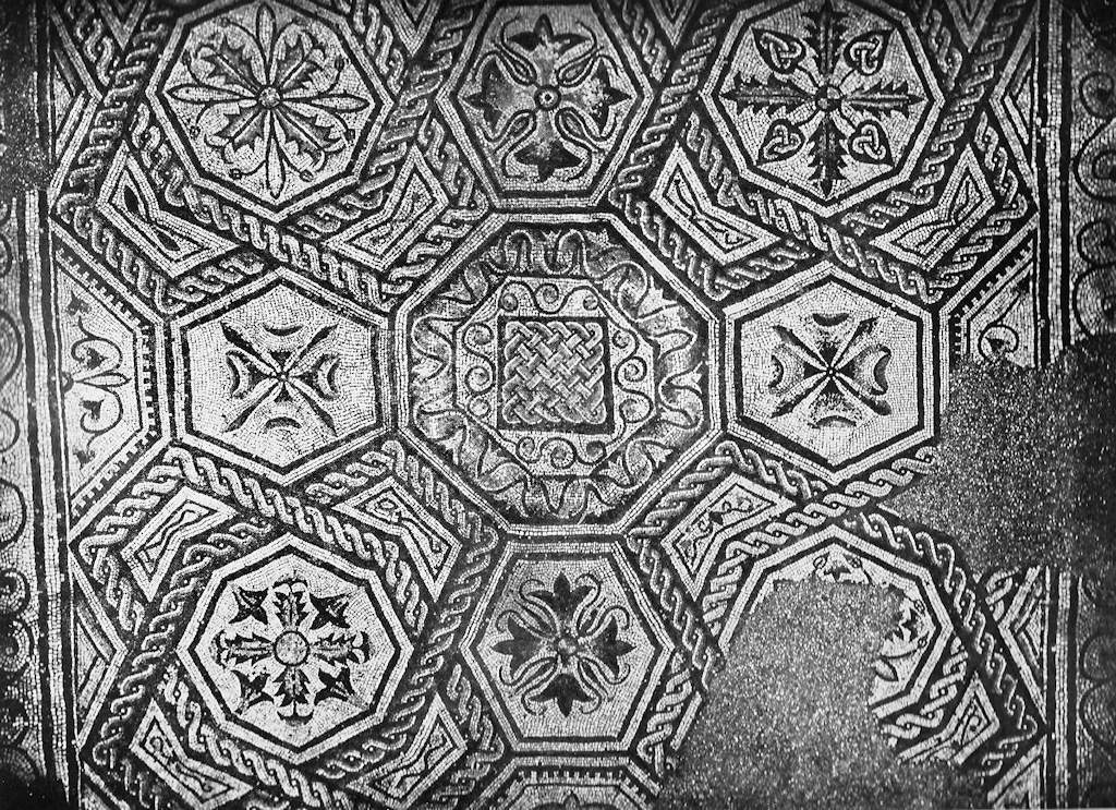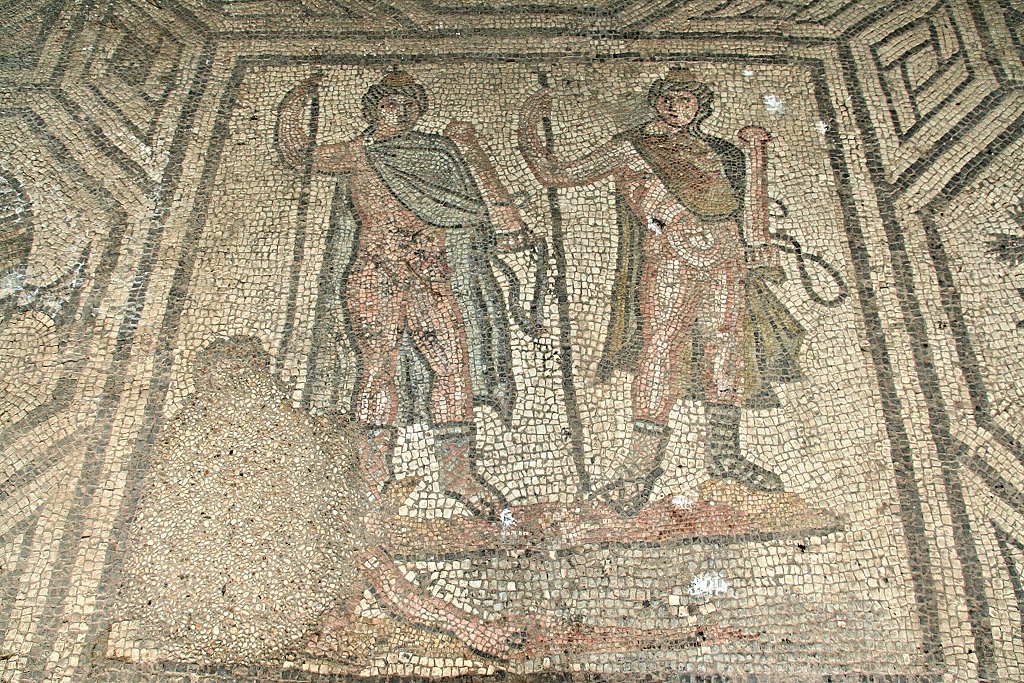 | The House of the Dioscures was built in apartments and shops in the south corner of the Garden Houses. In the first quarter of the fifth century walls in latericium and vittatum were added to the opus mixtum from the second century AD. Other walls were demolished. Click here to open a detailed plan of the house with the building phases (Heres 1982, fig. 84). Click here to open a detailed plan of the house with the mosaics (Parco Archeologico di Ostia Antica). Click here to open a reconstructed plan of the Hadrianic apartments and shops in which the building was installed (Parco Archeologico di Ostia Antica). Vestibule A, with a curved wall and a curved threshold, is the main entrance. In the back wall of room C are two rectangular niches flanking a semicircular niche. The niches are precisely opposite the main entrance of the building, but this would be noticed only after walking through the vestibule and room B. Room D, next to the main entrance, may have been a shop. It was connected with the house through room E. The south part of the house is shielded by a wall, behind which is service corridor U. Rooms T and S, next to a staircase, may have been used for storage. Corridor F and the former medianum G received light from the courtyard of the Garden Houses, but three windows in room G were blocked. In hall H an alcove was built, on the floor of which is a black-and-white mosaic with meanders. In front of that, in the hall itself, is a polychrome mosaic with in the centre the two Dioscures, Castor and Pollux. They are surrounded by octagons with a beaker, fruit, kantharoi, vases and baskets. This was a reception room. Room I was the main hall (10.00 x 10.50), also with a polychrome mosaic. We see Venus Anadiomene in a shell supported by two tritons, surrounded by Nereids on sea monsters. At the north side is the inscription PLVRA FACIATIS MELIORA DEDICETIS, "That you may do more and set up better things!". Parallels for the inscription have been found in North Africa. The smaller rooms M and L both have an alcove. In the walls of the alcove in M are terracotta pipes for the heating of the room. The hot air came from a nearby private bath. Room M has a polychrome mosaic with octagons and stylized plants. In room L is a black-and-white geometric mosaic, but also with a palm branch and the letters PE, which most likely stand for Saint Peter. Along the west side are bathing rooms that were reached from the north. In frigidarium O are two apsidal basins. Next to O is a small room with two windows. Room P was a caldarium, witness the raised floor and pipes in the wall. Room Q is a second caldarium, with a rectangular and an apsidal basin. All these bathing rooms were decorated with marble. The small corridor R has a hacked out niche in the back wall. To the north-west of the bathing rooms is a cistern. The Dioscures were worshipped in Ostia as protectors of shipping, also as a public cult. Therefore this house may have been inhabited by an official working for the supply, especially grain supply, of Rome. He lived at a time when Rome itself was threatened by invasions. In 410 AD Alaric sacked Rome. It is noteworthy that at such a late date pagan deities are depicted. |  Plan of the house. After SO I. |