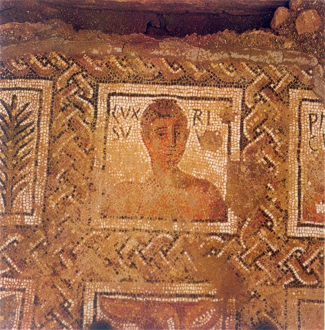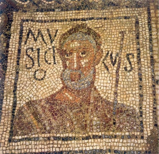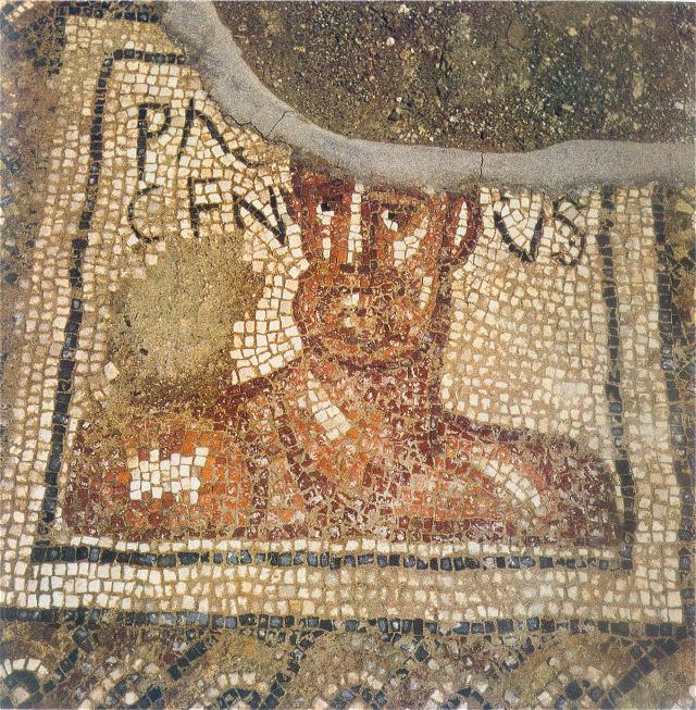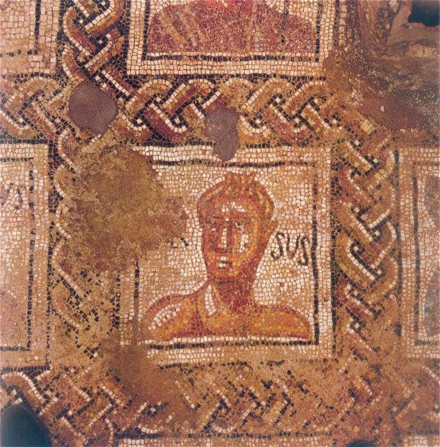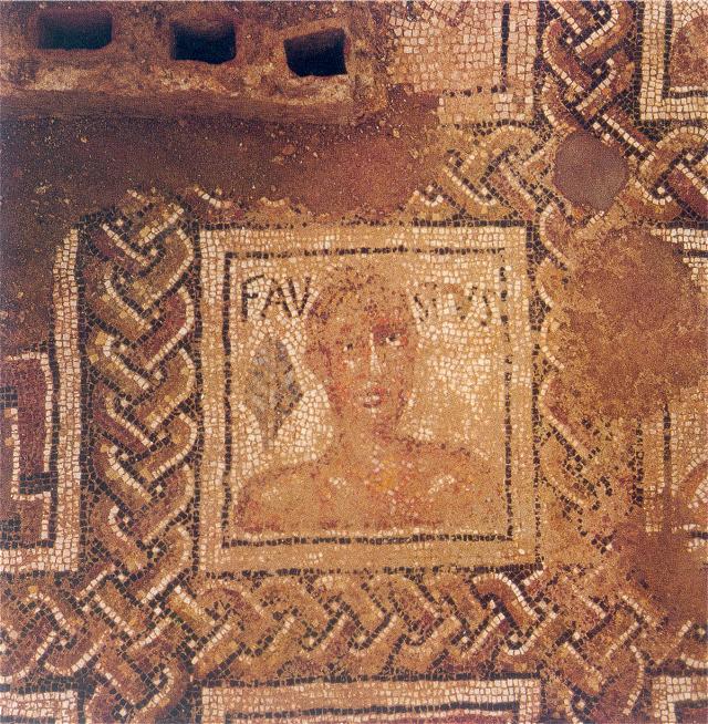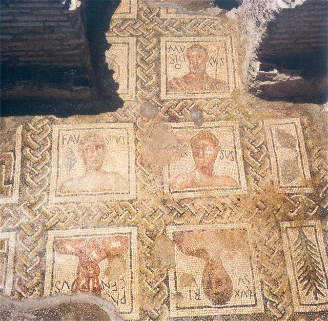 Drawing of the mosaics in the heated rooms. Parco Archeologico di Ostia Antica.The names of the athletes are written on either side of the head. The referee is called Musiciolus ("Harmonious"). He is bearded and around his hair is a fillet. In his left hand is some sort of sceptre. The athletes are naked. One is called Faustus ("Lucky"). A palm branch, referring to victory, is to the left of his head. The athlete next to him is called Ursus ("Bear"). The other two athletes are opposite Faustus and Ursus. Their names are Luxsurius ("Voluptuous") and Pascentius (the meaning of his name is not clear; probably it has a Christian connotation). These athletes are not known otherwise. Next to and above Musiciolus are three more frames, in a small apse (a later addition). Two depictions have been preserved, of weights used in the long jump, and of a metal vessel for oil, that was carried together with the strigiles. Palm branches are depicted in frames to the right of Ursus and Luxsurius. The mosaic was probably made in the early fourth century.