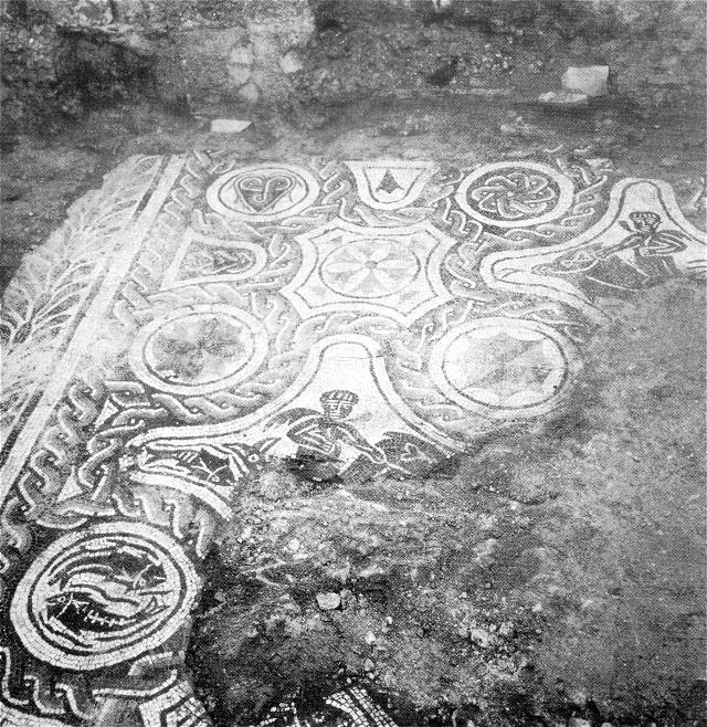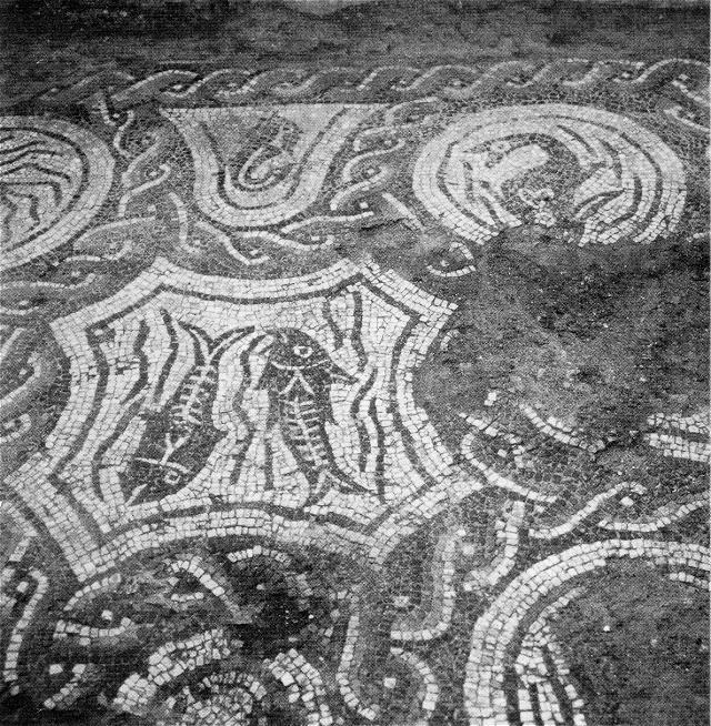 Drawing of the mosaics in the rooms to the north of the heated rooms. Parco Archeologico di Ostia Antica.In the heated rooms three mosaics were found: a black-and-white geometric mosaic at the west end, a polychrome geometric mosaic in the room at the east end, and a polychrome mosaic with busts of four athletes and a referee in the central room. Unfortunately the mosaic with the athletes was stolen shortly after the excavation.