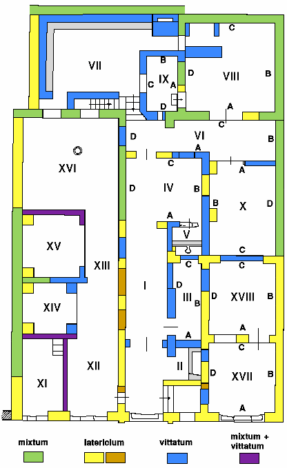 ![]() Click on the image to enlarge. Plan of the building. South-east is up. After Gasparri 1970, fig. 1 and SO IV. |