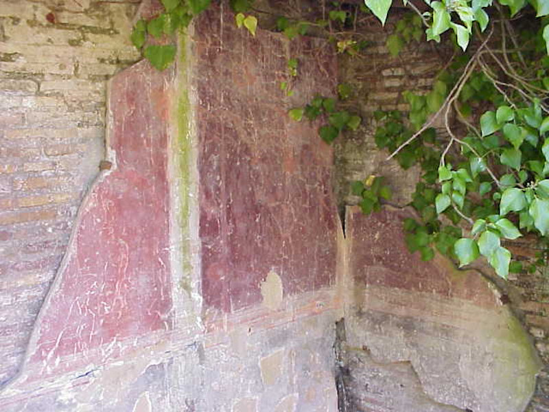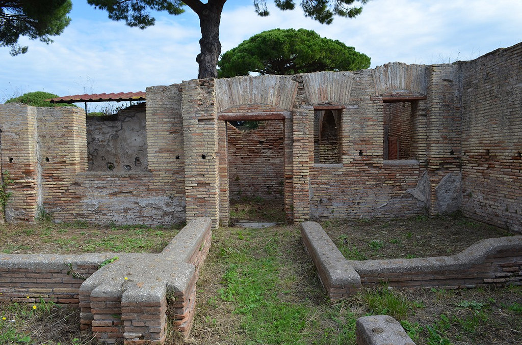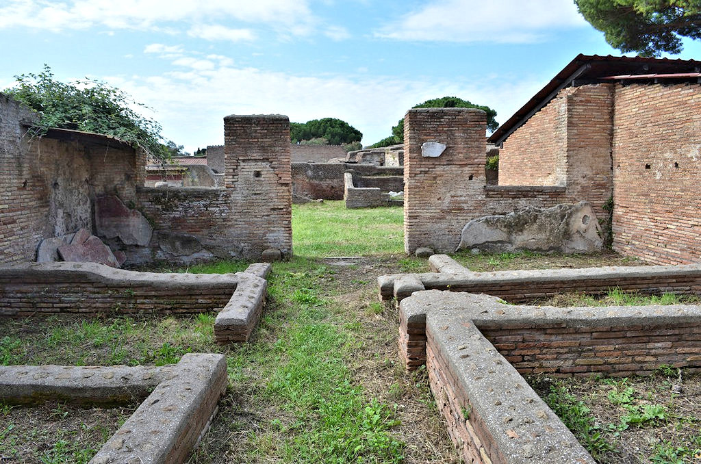 A bit to the south of the Macellum, at the west end of Via del Tempio Rotondo, is the small House of the Shrine. The building is probably from the period of Commodus or Severan. The west part is made up of six rooms flanking a corridor, created by secondary walls. Light was provided by windows in the west facade and in a wall that separated the rooms from a small courtyard and a vestibule to the east. In the north-east corner of the courtyard a cult room was erected (area c. 6.5 square meters). The resemblance of this cult-room to Shrine III,II,11, from the period of Antoninus Pius or somewhat later, may be noted. The masonry of the cult room has not been dated. It is opposite the entrance of the courtyard from the vestibule. The doorway is flanked by engaged columns and has a tympanum. Above the entrance the bricks were originally painted red, the mortar white. The room is divided into two parts, covered by a cross-vault and a barrel vault. In the rear corners are two low, masonry bases. In the barrel vault of the rear part, a little above the lateral walls and on either side, are three small plastered depressions. Busts may have been painted here. In the back wall of the rear part is a small wall niche, perhaps for a lamp. Below the remains of the collapsed ceiling were found: a terracotta statue of an enthroned female deity, perhaps Fortuna, partly gilded (Trajanic or Hadrianic); two bacchic herms; a female head; a pineapple. The statue was probably placed between the two bases. The lamp in the tiny niche would then have been burning behind the head of the deity. The function of the ground floor is not clear. The cult room and the courtyard (together c. 35 square meters) are quite large in comparison to the remaining rooms on the ground floor (c. 90 square meters), and there is no internal staircase. Perhaps we should think of the premises of a small religious guild. |
