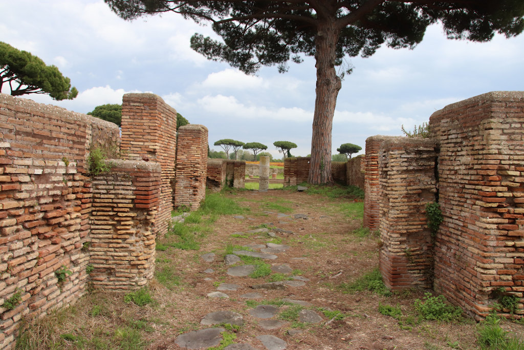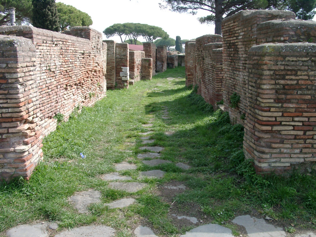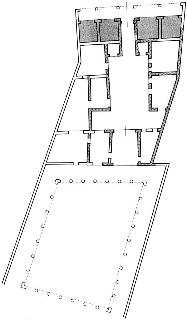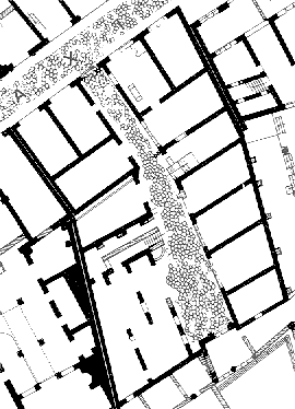 This is a Hadrianic building (opus mixtum), flanking a paved dead-end alley (Vicolo del Dioniso), leading from the western Decumanus to the south. Below the building the remains of the atrium of a republican domus were found. Shops face the Decumanus and the alley. In the south-west corner, to the south of a staircase, are halls. The room to the east of the entrance was a bar. A door in the back wall leads to another shop. Two holes in the jambs of this door show that the door could be barred from the inside. Two bar counters can be seen on the plan in Scavi di Ostia I. Of the one in the north corner, next to the main entrance, only marks on the east wall can be seen today. The second one, in the south part of the room, has disappeared. |