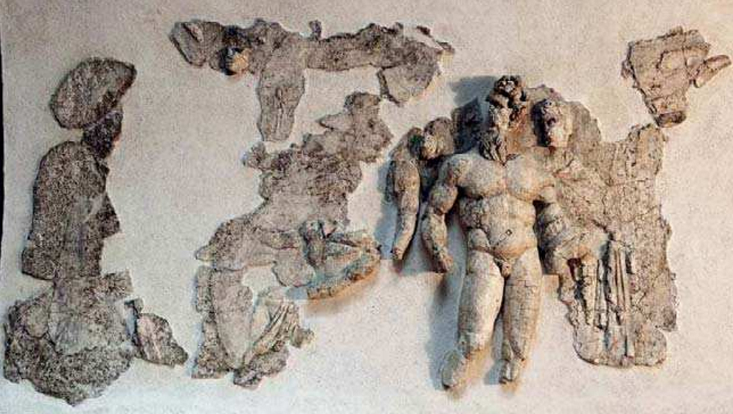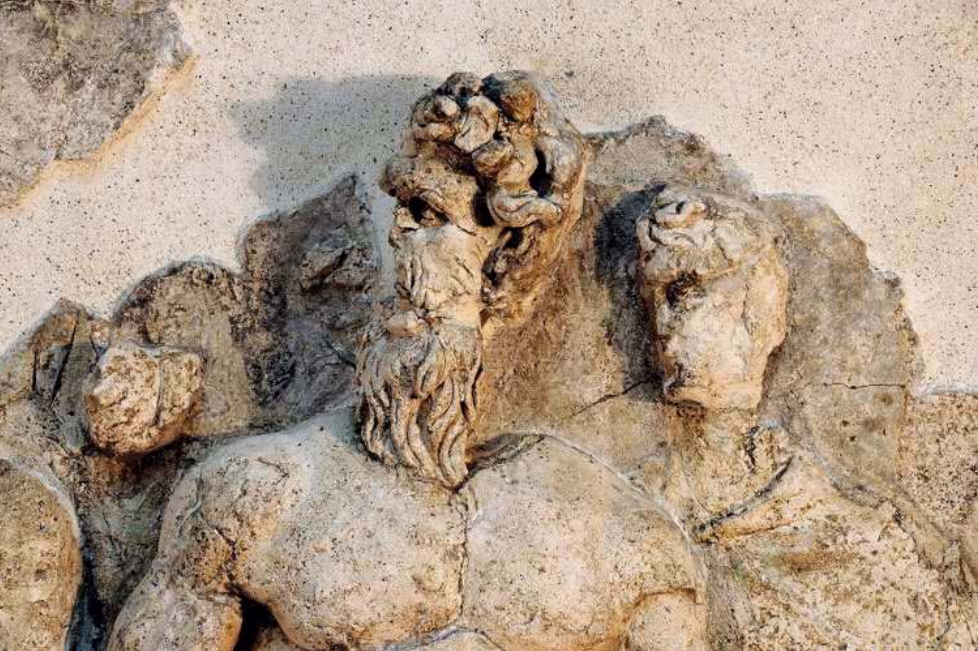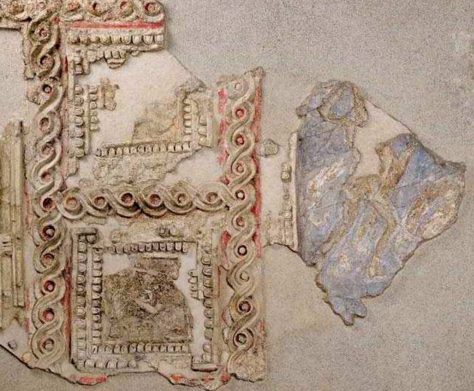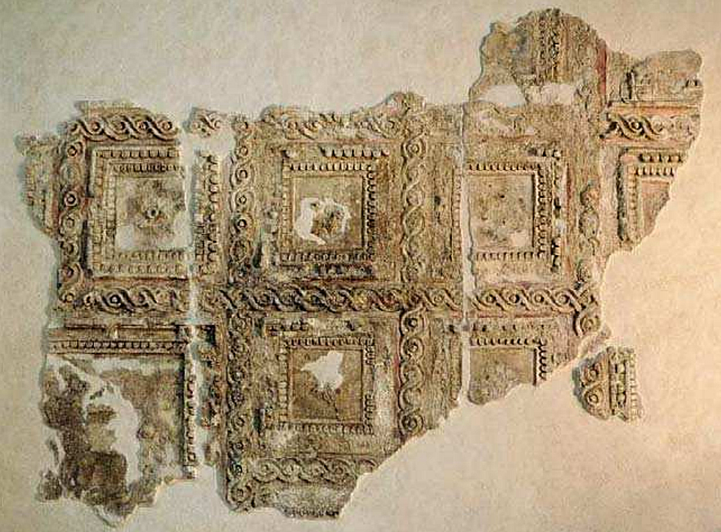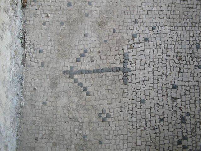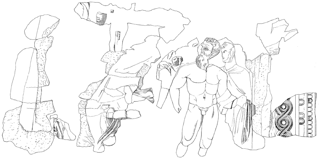 Plan of the building (M. Medri). North is to the left.In the centre of the west part is vestibule 1. Through room 10b the apsidal room 14b was reached, probably an unctorium, that is, the room where the body was oiled before people went to the palaestra (27). Room 10b also led to a frigidarium (cold bath; 10a), with an apsidal basin adorned with rectangular and semicircular niches (9). In room 10a is a black-and-white mosaic with the depiction of a city wall and a swimming man. Rooms 13a and 18 were tepidaria (lukewarm rooms). In room 18 fragments were found of the stucco decoration of the ceiling with mythological figures, from the late first or early second century AD. Room 20 was a laconicum (sweating room), rooms 19a and 19c caldaria (hot baths), with basins.