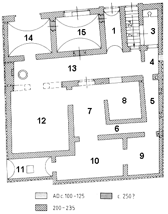 This is a small, but very interesting house, measuring 13.50 x 14.50. The building was erected in the Severan period (c. 200 - 235 AD; opus latericium and mixtum). Alterations have been dated to c. 250 AD. In the facade are four doorways. Two brick pilasters, which must have carried a brick pediment, frame the doors of entrance-corridor 1 and staircase 2a. Wide doorways lead to shops 14 and 15, with floors of opus spicatum. Traces in the east wall of room 3, to the south of the staircase, indicate that a latrine was installed here. The entrance-corridor and the shops were covered by barrel vaults. Shop 15 eventually became a separate unit. The central room of the building is area 13, that did not have a ceiling. It was an important source of light. At the north end is a well with a marble well-head. A bench with a niche was set against the north wall. The area has a simple black-and-white mosaic floor. On the walls red lines were painted, as in the shops. A side-entrance leads to room 4, to the south of area 3. In the rear part of the building we encounter central hall 7. It is flanked by rooms 8 and 12, the main living and reception rooms. In the east wall of room 12 were three windows, later converted into a wide doorway. This room was two storeys high. Below the floor is a cistern. Room 11, in the north-west part of the building, has a barrel-vault with a skylight (store-room? shrine?). The other rooms in the rear part had ceilings resting on wooden beams. A staircase above room 3, in the south-east part of the building, led to apartments above the front part of the building. Staircase 2a, reached from the street, led to a separate apartment above the rear part. |