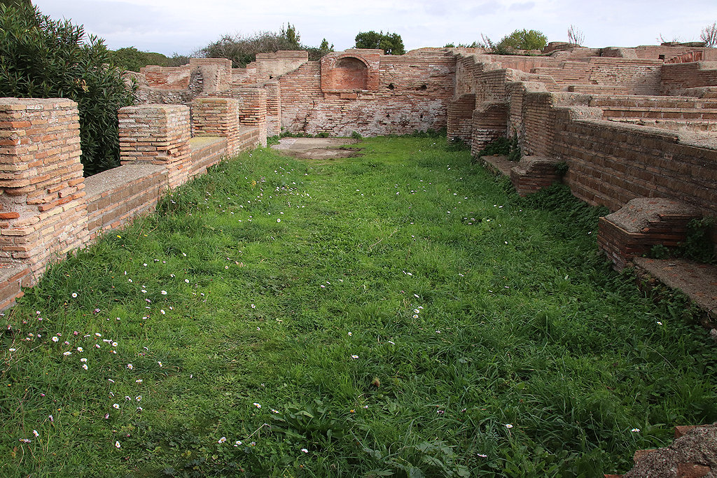 Along a flight of steps in the vestibule the first bathing room, a cold bath (frigidarium 16) was reached. The walls and floor were decorated with marble, but on the floor are also some mosaic tesserae. At the west and east side are cold-water basins.