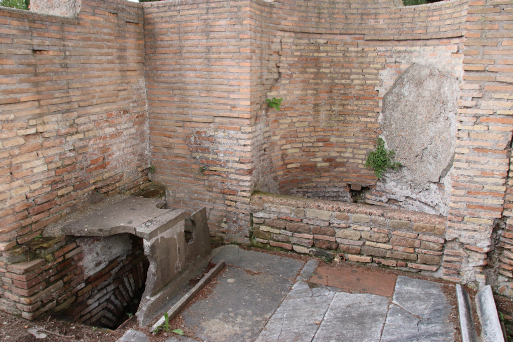 The large latrine 4 could also be reached from the corridor. It seems to have been open to the public. The masonry is Trajanic. It has a marble floor. The marble seats of the latrine have disappeared. In the west wall a fountain-niche was added in c. 250 AD. Obviously many people visited the building. Perhaps the carriages were taxi's, stationed in the east half of the building, where no rooms were built in the Trajanic period.