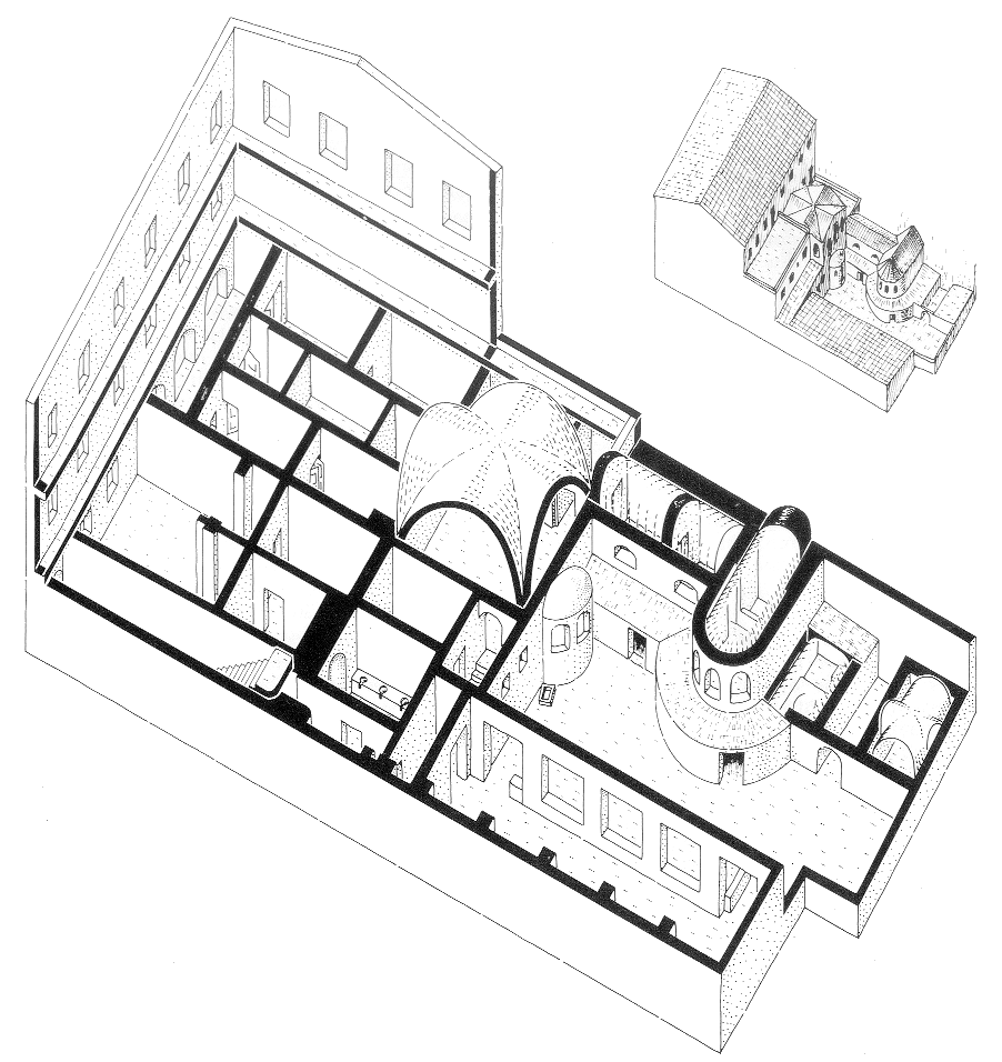 In the north-east corner of the building is the isolated room 24, with a completely preserved barrel vault, changing to a cross-vault in the centre. In the south-east part are courtyard 25 and porticus 26. Between the piers of the porticus are low benches. In the east wall is a large wall-niche. It may have contained one of two portrait busts from the second half of the third century that were found in the building, perhaps of the Neo-Platonic, third-century philosopher Plotinus. The busts gave the building its name. Room 24 and porticus 26 were built c. 235-250 AD. The temple was now demolished, There was another porticus along the north wall that was replaced by baths. It has been suggested that in this period the building housed a Neo-Platonic school.