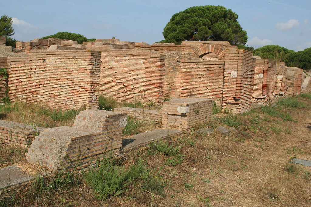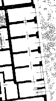 | This is a Hadrianic row of interconnected shops on Via delle Ermette. To the south is an external staircase, flanked by a corridor. A (blocked) door in the west wall of the corridor and another (blocked) door in the northernmost shop led to house V,III,3. |  Plan of the building. After SO I. |
