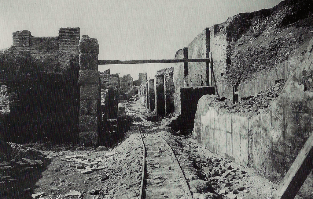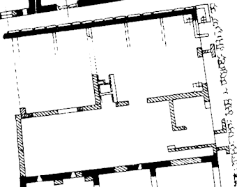 | This is a badly preserved building in the east half of block V,VI. The main interest is in the north wall. It is made of large tufa blocks (opus quadratum) and belongs to the third or second century BC. In the plaster on the wall are the imprints of wooden partition walls. |  Plan of the building. After SO I. |