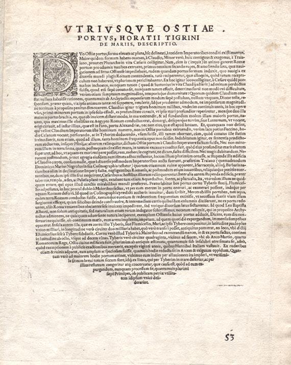 Numbers are used to identify specific buildings in the scene. For example, number 2 is the main gate that leads to Rome, "Porta precipua Romana", number 4 is the "Aquaeductus", and 10 indicates the walls which surround and protect the port.