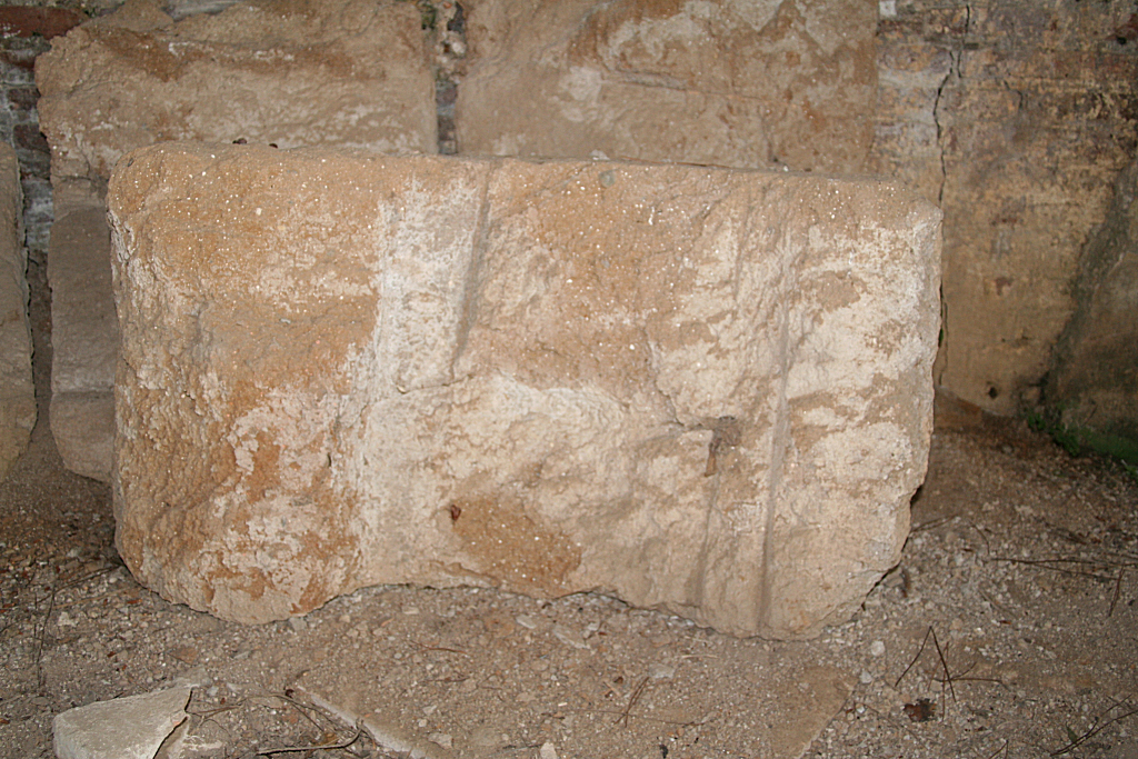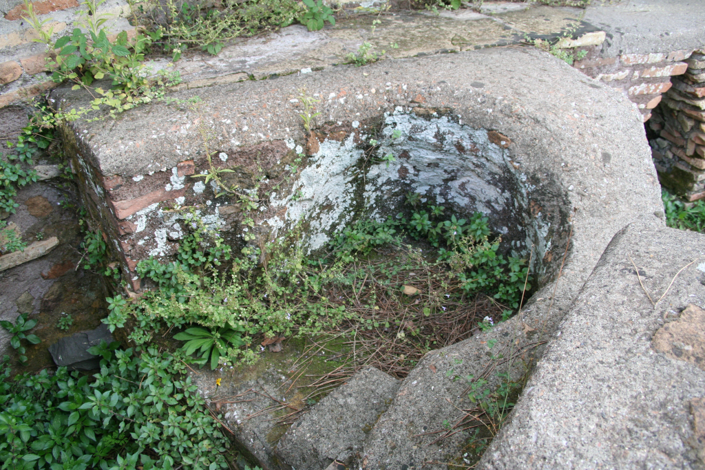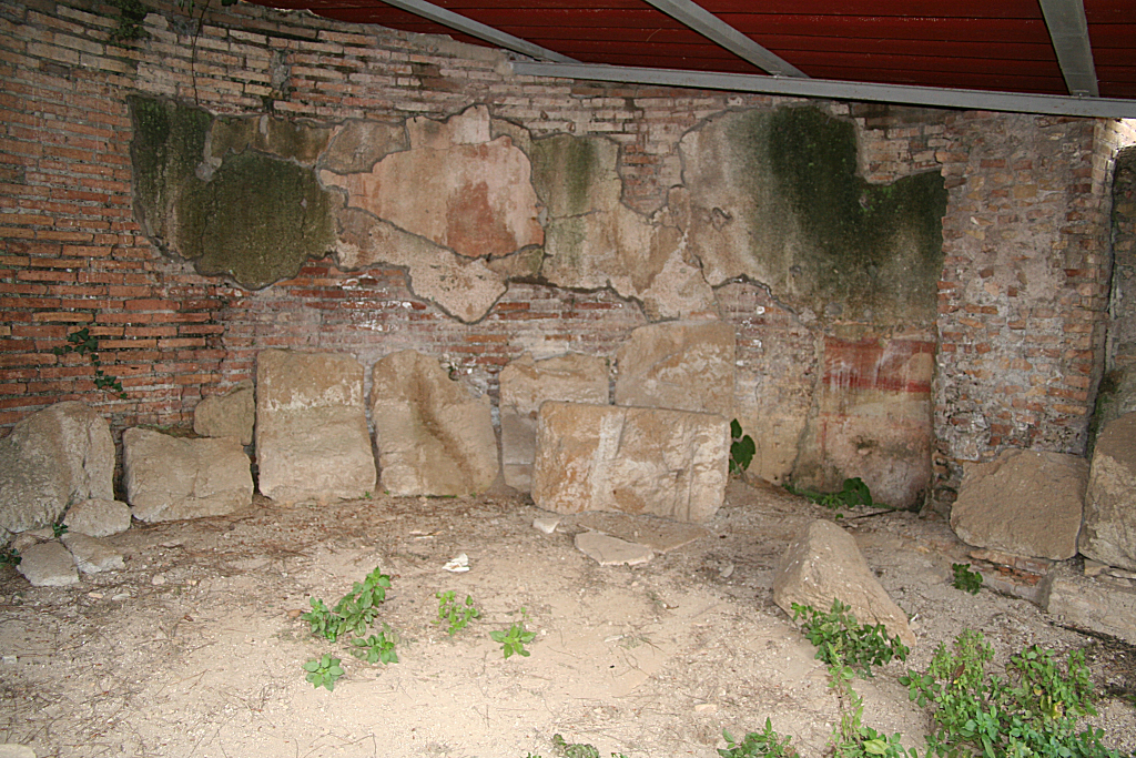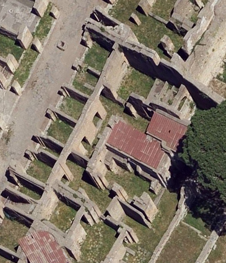 In the House of the Cistern four units can be recognized: the original Hadrianic building; a bakery in the north and central part; water-wheels and cisterns in the south part, related to nearby baths; a late antique exedra in the north part. The exedra, I,XII,3, is described separately. The Hadrianic remainsIn the north part of the building are a few remains of a very large octagonal room from the Hadrianic period. The room contained four large semicircular niches, starting at floor level. The north-east one was obliterated by Exedra I,XII,3, the north-west one is preserved badly. The south-west niche - with the exception of the west part, the reconstruction of which is hypothetical - and especially the south-east one - in which an oven was installed - are preserved quite well, with a maximum height of a few meters.