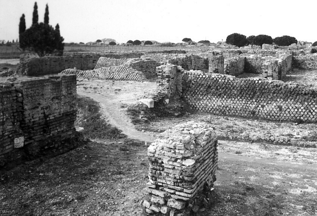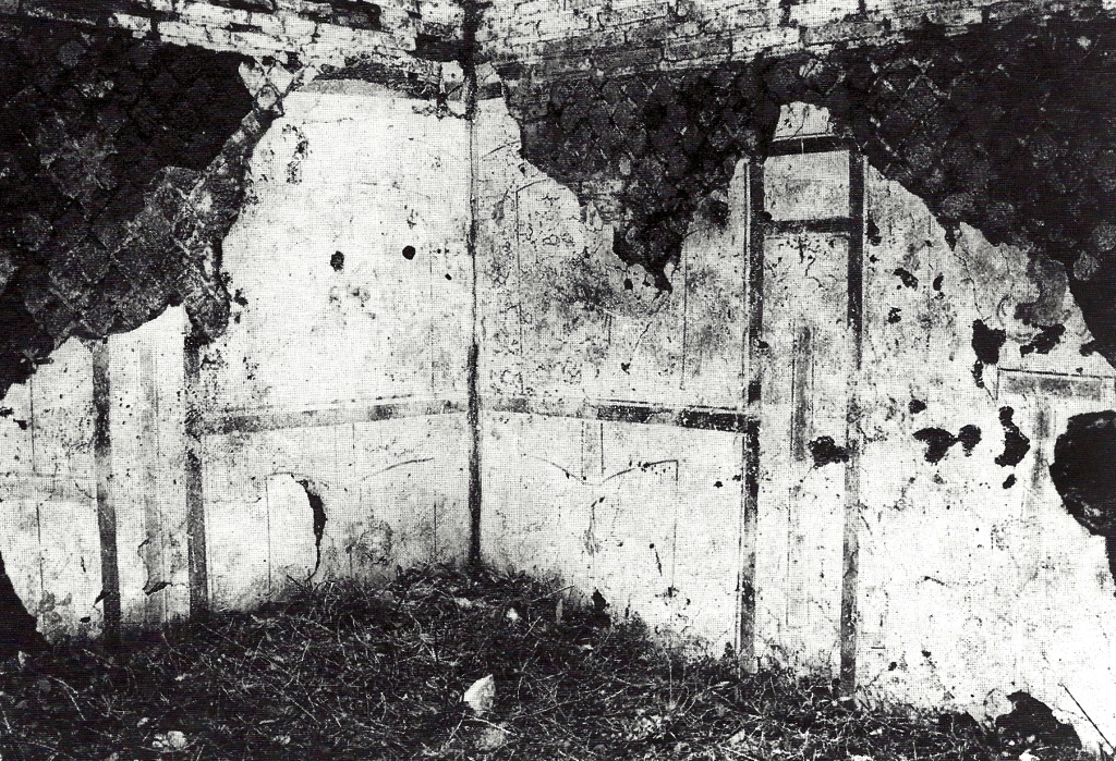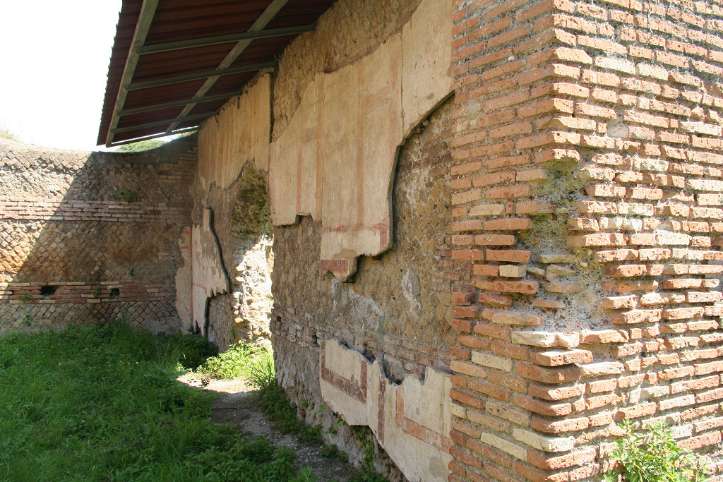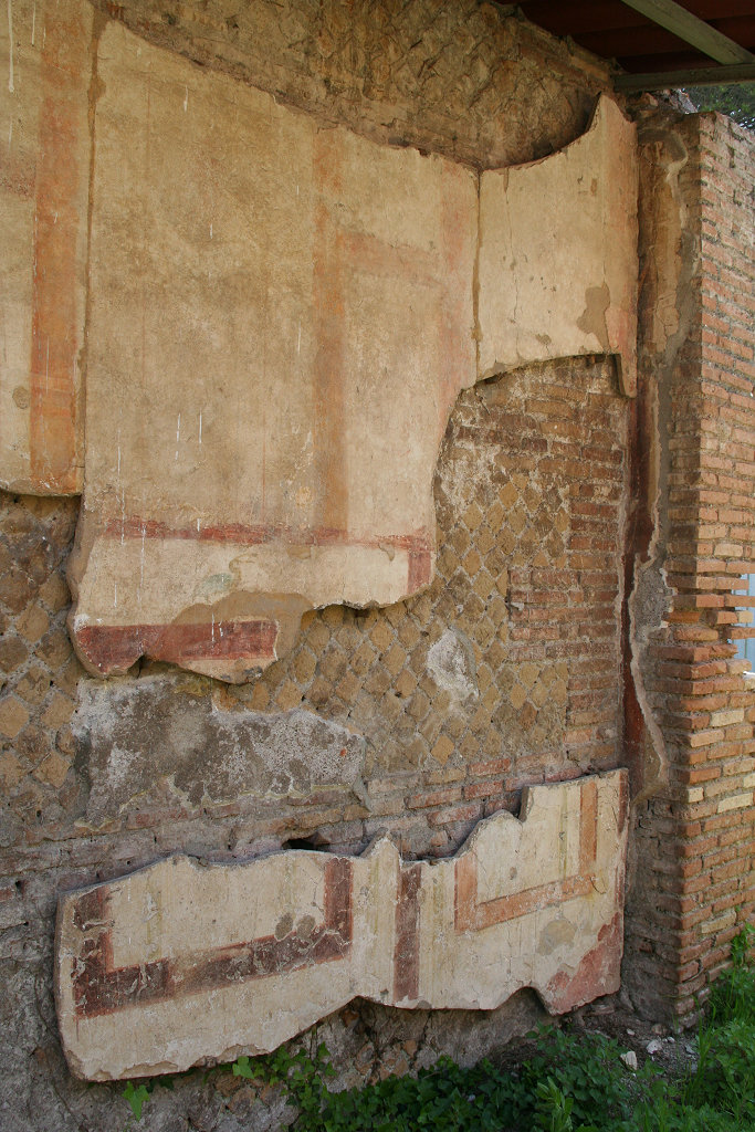 In the south part of block IV,II is an unpaved square. It is surrounded by rooms that were built during the reign of Trajan (opus latericium), and Hadrian and Antoninus Pius (opus mixtum). In building or rather hall 13 is a double water basin. Building 14 consists of a few shops. Paintings of good quality were found in shop 1. Some of these can still be seen on the south-east wall, others, from the north corner, were taken to the storage rooms. Lines and wide bands (dark-red, light-red and yellow) create panels (some reminiscent of aediculae) on a white background. In the aediculae are tall, slender rectangles. In the inner panels are small motifs, including a bird. The paintings were made in the Severan period. The other buildings were modest apartments or used for commercial purposes. In the south corner the Mithraeum of the Animals (IV,II,11) was installed, which is described on a separate page. See also a photo album from 2008 of building 14. |
