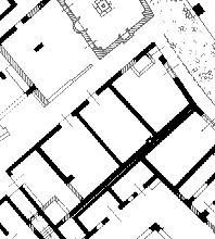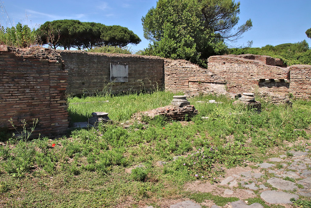 This is a row of four Hadrianic rooms (opus mixtum), to the north of the House of the Columns (IV,III,1). On the remains of the east wall of the north-eastern room, accessible from the southern stretch of the Cardo, are three marble column bases. Do they belong there? The funerary inscription of Publius Celerius Amandus (EDR080739) has been attached to one of the walls. |