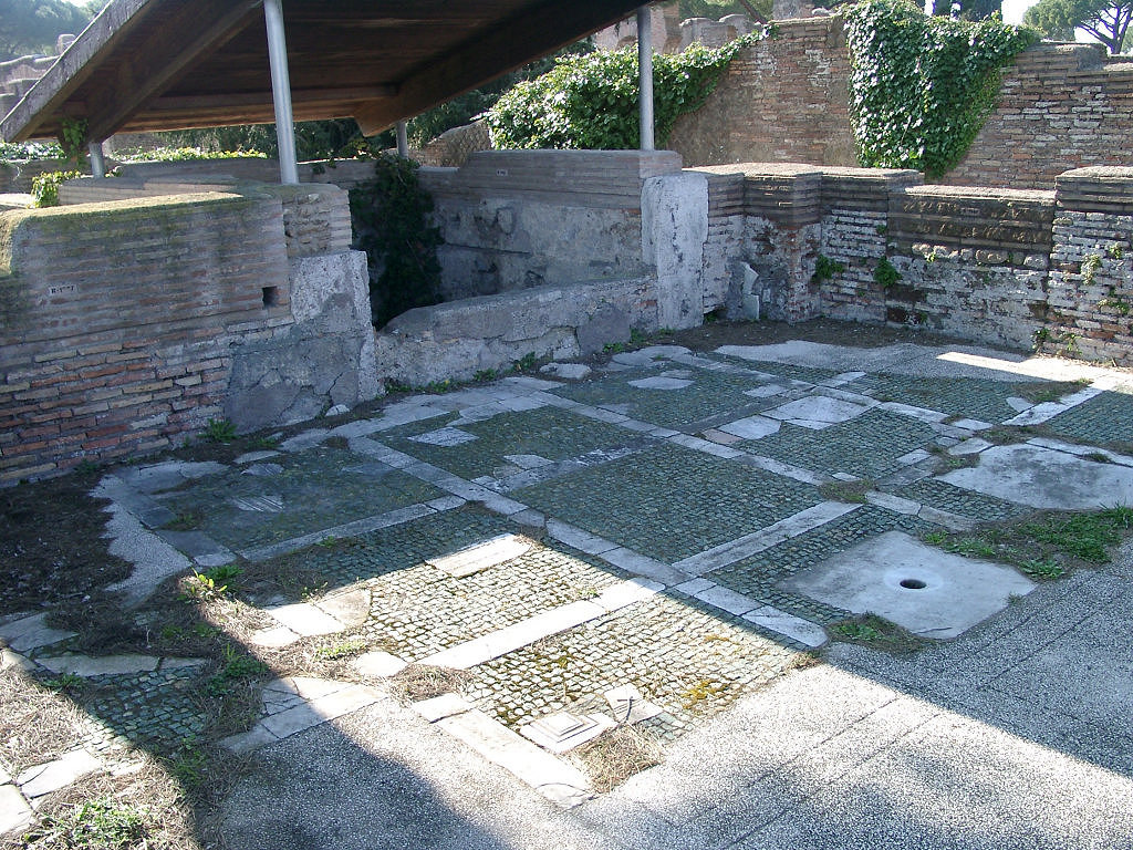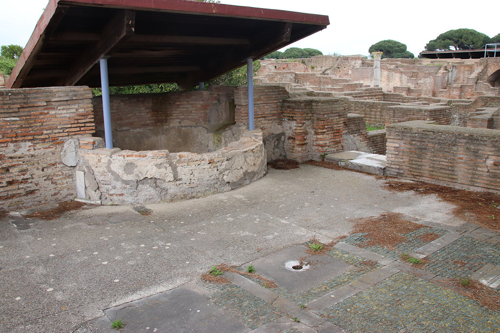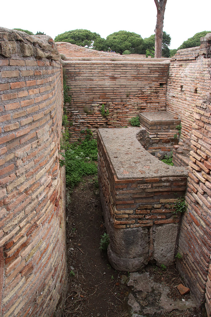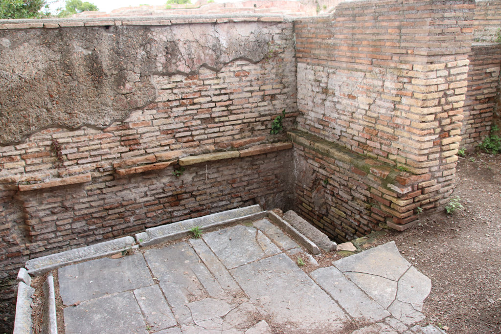The large latrine 4 could also be reached from the corridor. It seems to have been open to the public. The masonry is Trajanic. It has a marble floor. The marble seats of the latrine have disappeared. In the west wall a fountain-niche was added in c. 250 AD. Obviously many people visited the building. Perhaps the carriages were taxi's, stationed in the east half of the building, where no rooms were built in the Trajanic period.