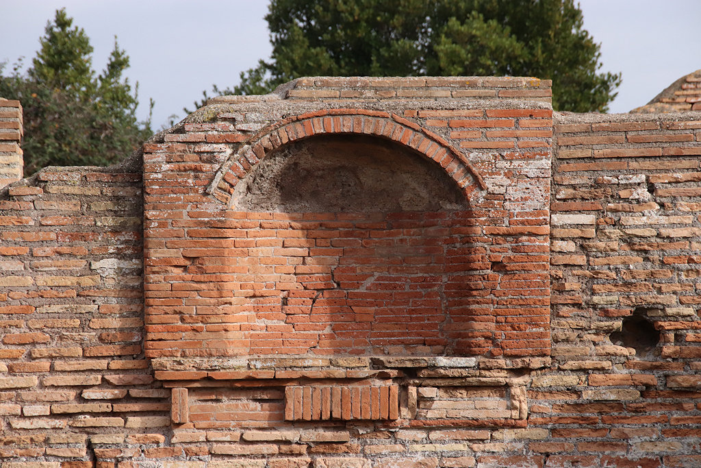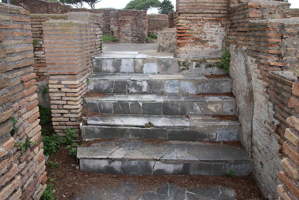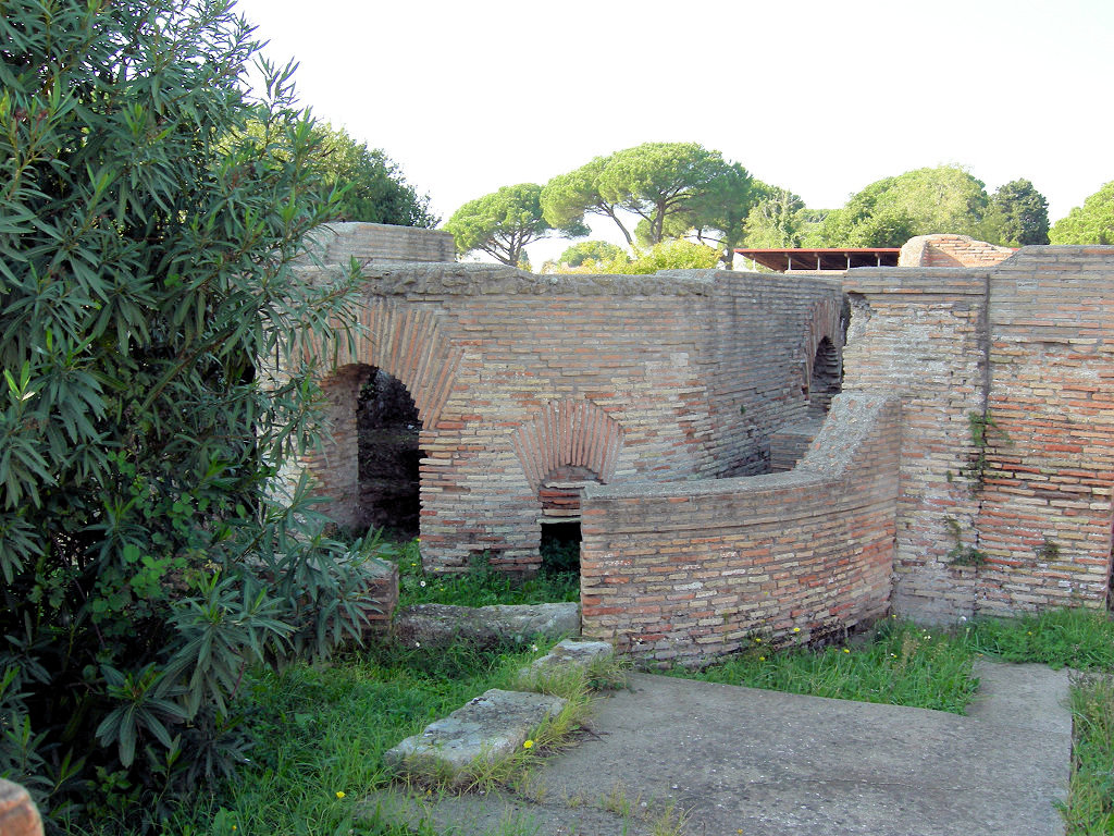 The north-west part of the building dates back to the Trajanic period (opus latericium). In the north part of the facade is the tiny portico 6, behind which is a cluster of rooms and back-rooms (7-12). Room 11 was probably a shop. Rooms 7, 8 and 9 may have had a domestic function (room 7 was originally a shop). The entrance of room 9 (width 2.21) has travertine door jambs, and recesses in the side walls, meant to receive the leaves of the doors. There is a low threshold. Both the recesses and the threshold suggest that, originally, carriages could enter the building here. Room 10, to the east, is a later, filled-in buttress of a water-basin in frigidarium 16. Above the room may have been a cistern.